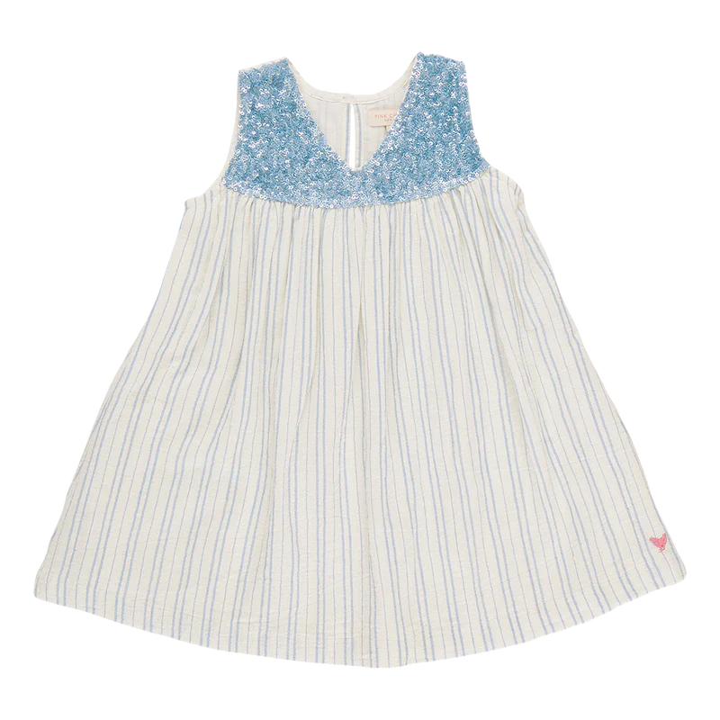 Classic Stripes! Thin and medium sky blue ribbons complement a sturdy white cotton gauze on our sparkling Girls Courtney Dress in Riviera Stripe. Don't let the shiny sequin detail on the chest of this perfect A-line silhouette fool you into thinking this dress is just for parties... wear it to school, the park and everywhere in between! Glitter button keyhole closure at back. You'll find our chic Riviera Stripe woven throughout our Spring Collection making both sibling and Mommy & Me looks easy to achieve.