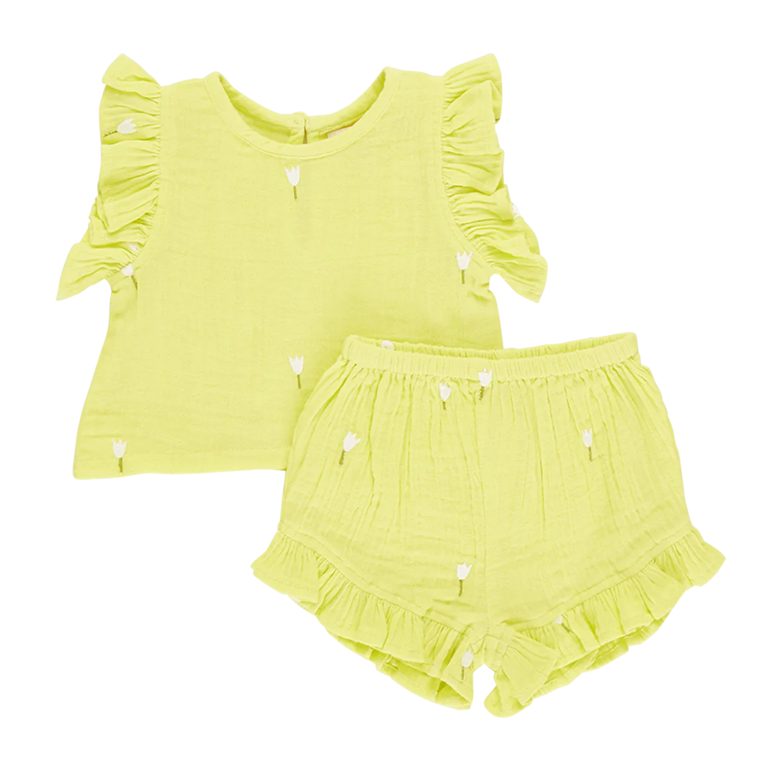 Shorts and Sweet! Delicate embroidered tiny white tulips sprout from a vibrant yellow double cloth cotton gauze ground on our comfy and casual Girls Roey 2-piece set. Perfect for a picnic playdate, this easy to move in set features generous ruffle sleeves and leg openings and a comfortable elastic waist. Keyhole opening at the back with a signature glitter button. Each piece is unique so placement of embroidery may vary. Pair with our Baby Girls Roey 2-piece set for a sweet sibling moment.