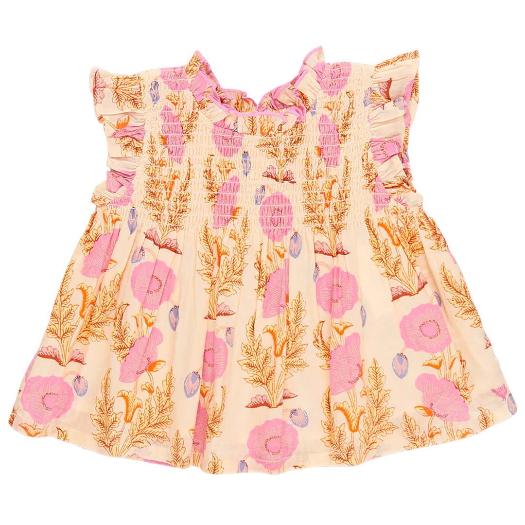 Golden Hour! Lush gilded poppys make a strong statement against a pale yellow ground in our Pink Gilded Floral print shown here on our Girls Stevie Top. A cousin to our popular Girls Stevie Dress, this versatile top features a coordinated pink ruffle at the neckline, a delicate ruffled arm, smocking at the chest and an invisible zipper at the back. You'll find Pink Gilded Floral on our Womens Emily Dress and Baby Girls Stevie 2-Piece Set for a bright and springy Mommy & Me moment.