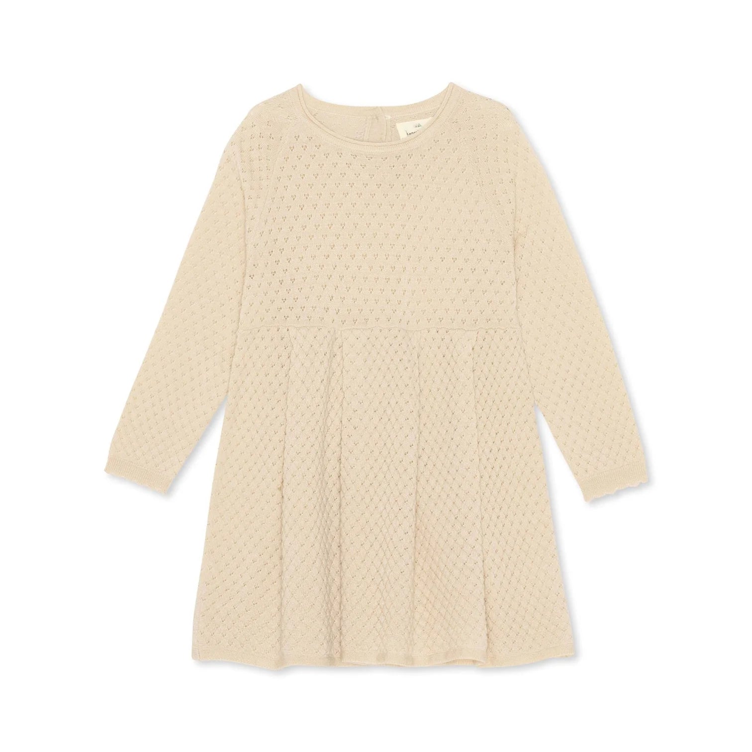 Snug and warm pointelle knit dress made in 100 percent soft merino wool. Designed with a flared frill cut and scallop edge cuffs. Closes in the back with a single mother of pearl button.