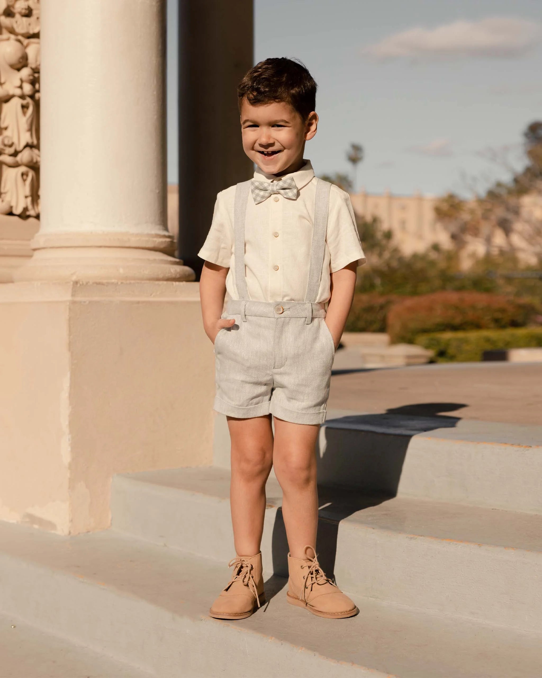 Our suspender shorts are the perfect staple piece for your little guy this spring! Effortless with button straps, an elasticized back waist, and pockets.