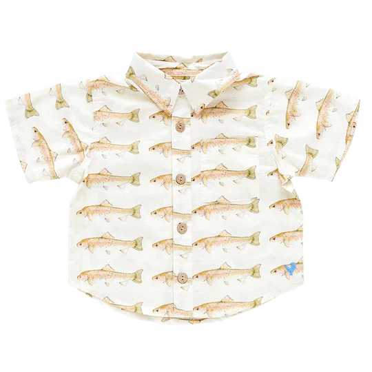 Fishing Expedition! In collaboration with Helmsie, Rainbow Trout swim upstream on our collection classic Baby Boys Jack Shirt. Designed with short sleeves and a front patch pocket. Faux coconut wood buttons round out the look. Pair with our Boys and Mens Jack Shirts for a coordinated Father / Son Look