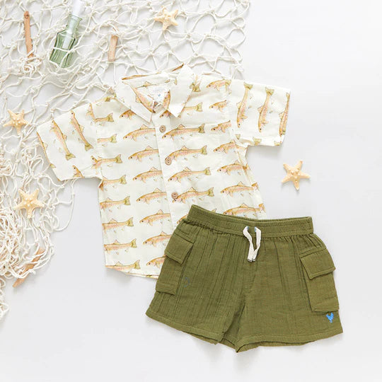 For the Boys! Play all day in our durable double cloth cotton gauze Boys Pull On Shorts. An elastic waist allows these bottoms to move with your child. Crafted in Capulet Olive and Dress Blues these match perfectly with any of our Boys Jack Shirts. Two side cargo pockets are well sized to carry all of a day's found treasures.