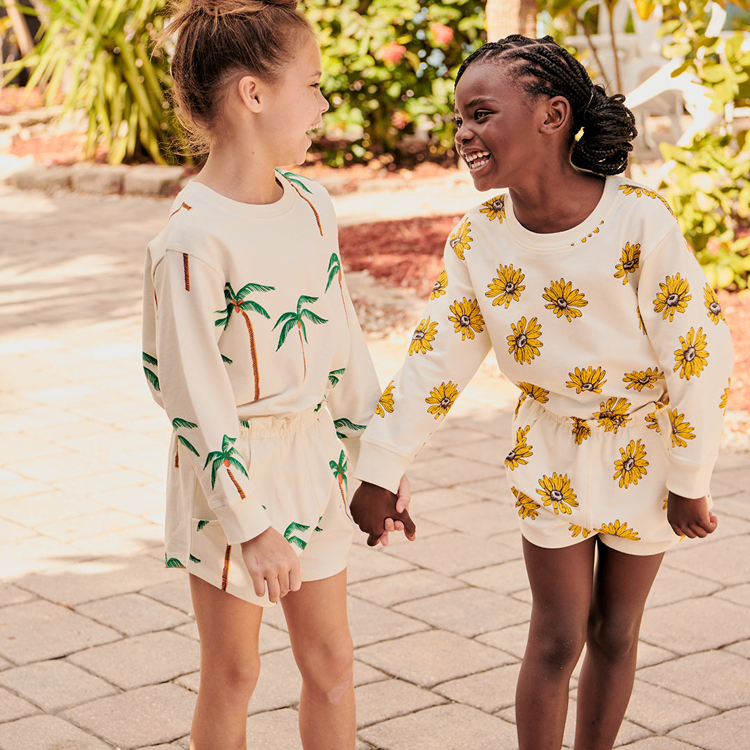 Island Vibes! Beachy coconut palms stand tall on a white sand background in our tropical Cream Palm Trees print, shown here on our Girls Organic Sweatshirt. This long sleeve crewneck has a boxy, comfortable fit. Loomed in GOTS-certified organic cotton with a touch of stretch to allow for easy movement. Our inks and dyes are classified eco-friendly by OKEO-TEX criteria. You'll find this breezy print woven throughout our newest collection of Organics.