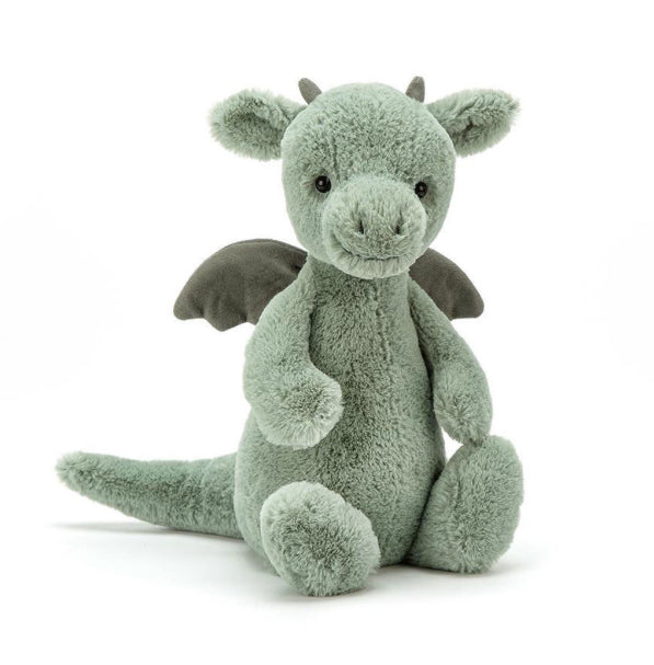 Bashful Dragon is a fierce little friend, with plenty of attitude! With supersoft fur in pale sage green, suedey horns and a long, squidgy tail, this brilliant beastie is pretty fantastic. We love those neat little contrast wings, chunky feet and fine flappy ears - what a legend!
