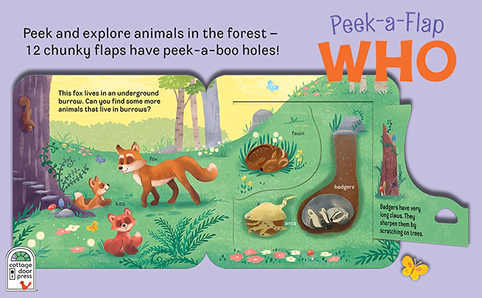 - Peek and explore the forest with fuzzy forest animal friends packed with educational facts and peek-a-boo surprises!