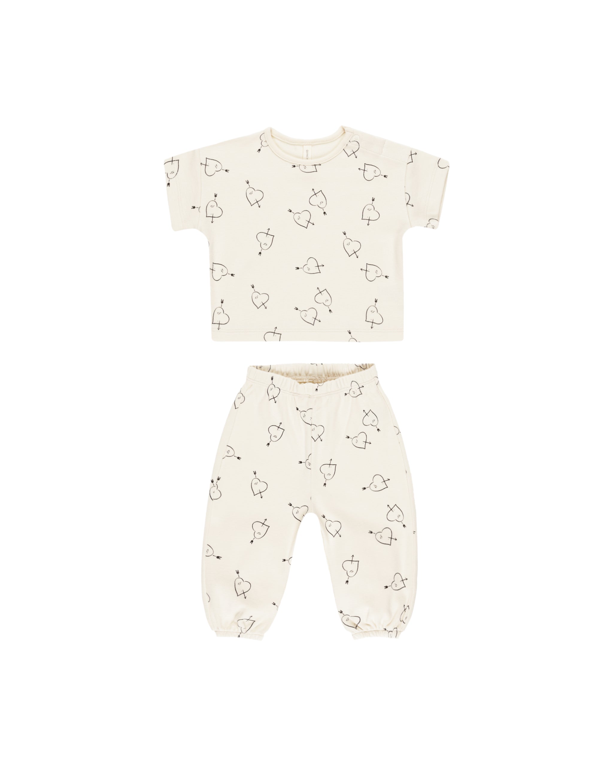 Introducing our JERSEY TEE + PANT SET in cupid print. Made from 100% organic cotton, this set offers superior quality and comfort for your little one. Enjoy the benefits of organic materials while your child stays stylish in this adorable cupid print. Shop now for a sustainable and fashionable option.