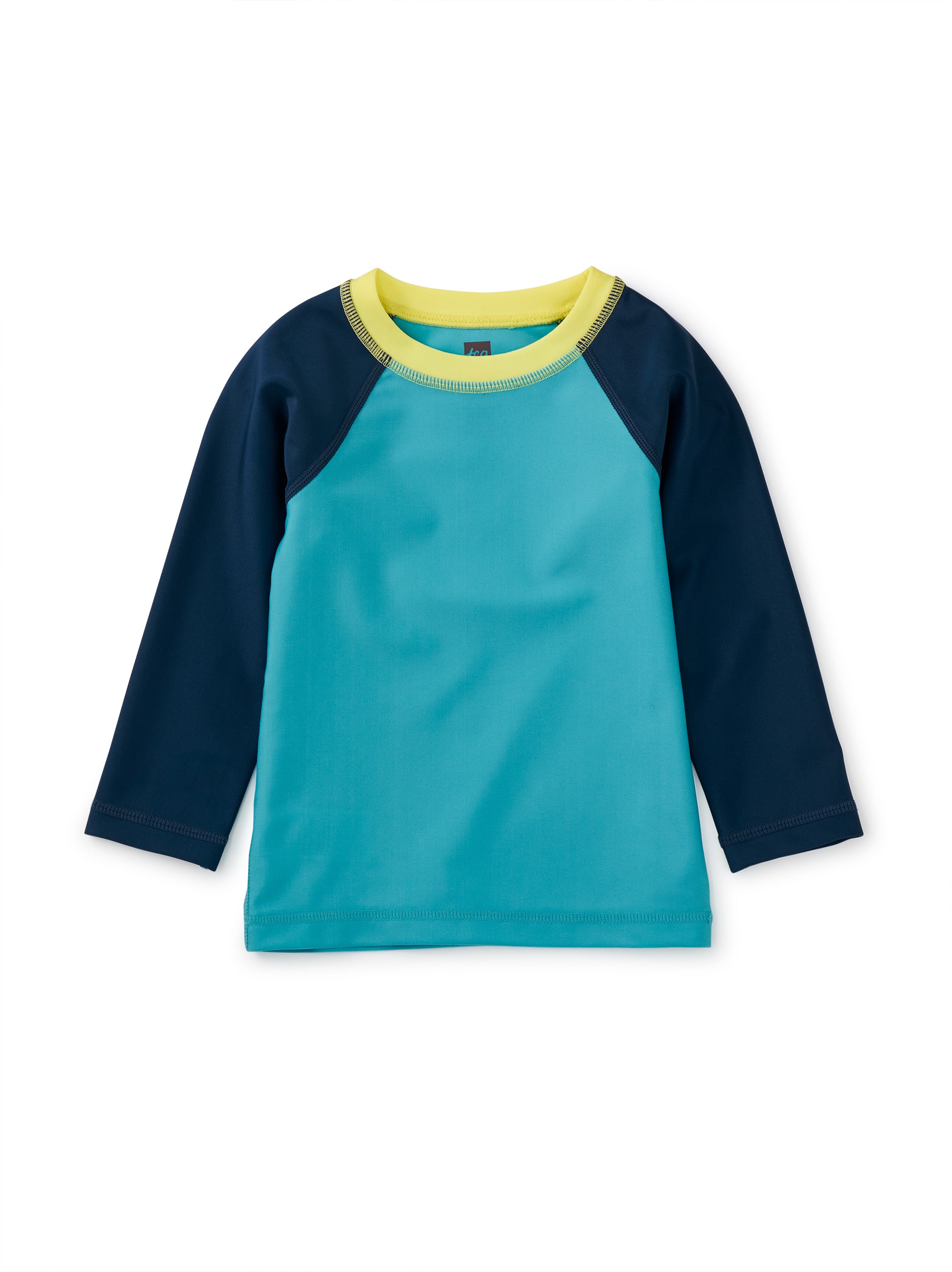Your little one will be well-protected with this UPF 40+ rashguard designed in ocean-blue summertime hues. Poly/spandex for just enough stretch and durability.
