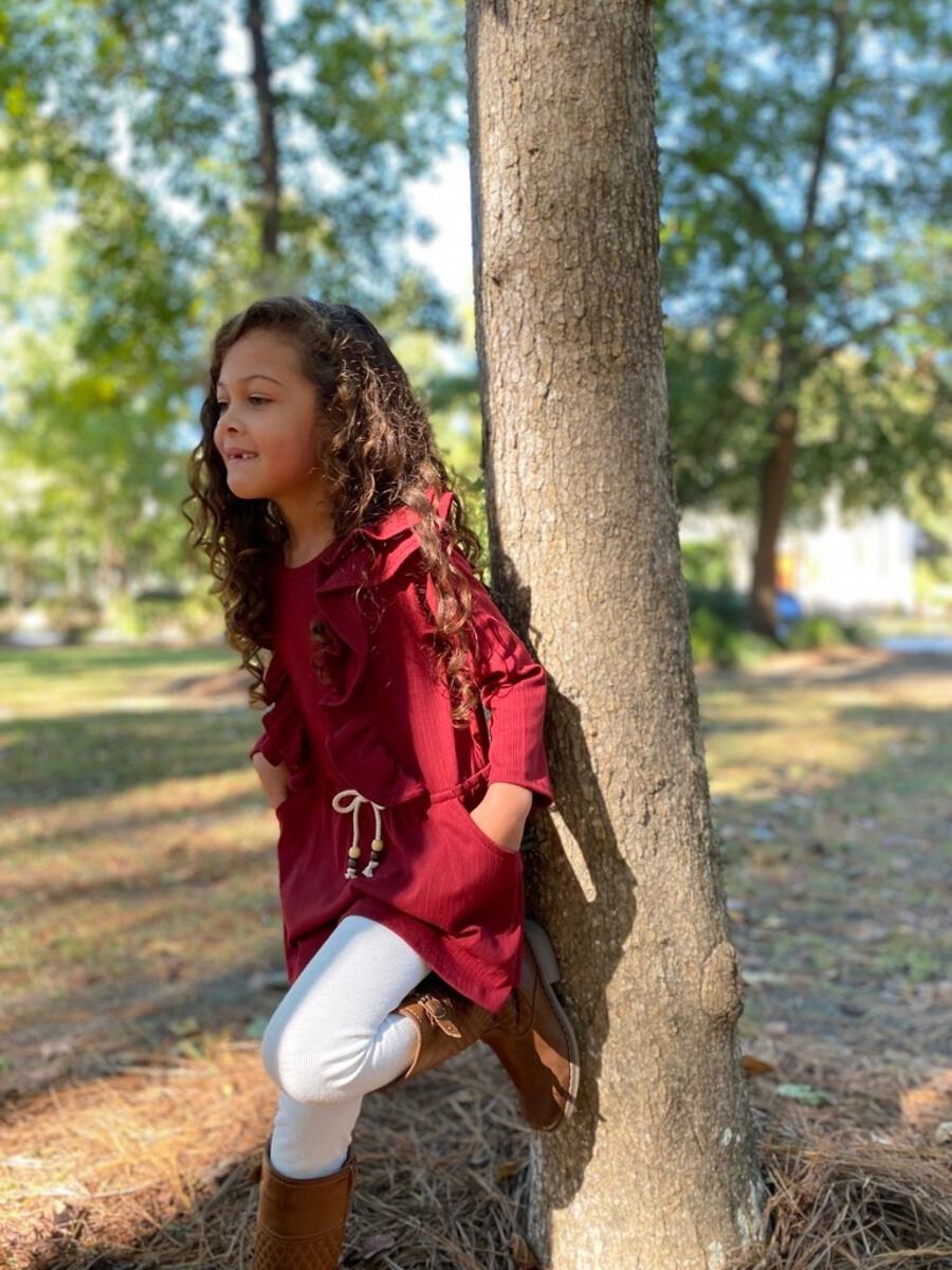 This lovely new style, in a ribbed jersey fabric, is new this season! With a ruffle on the sleeve and a sweet tie front with wooden beads... and don’t forget it matches baby sister in the Alaya Romper!
