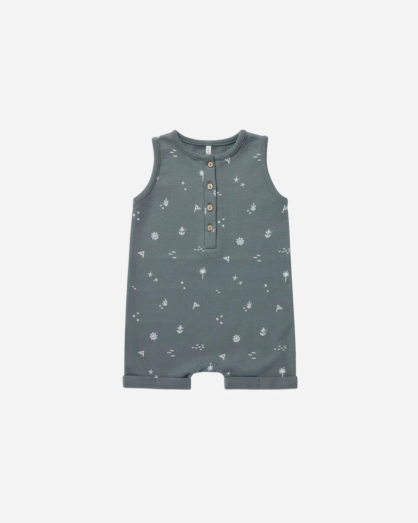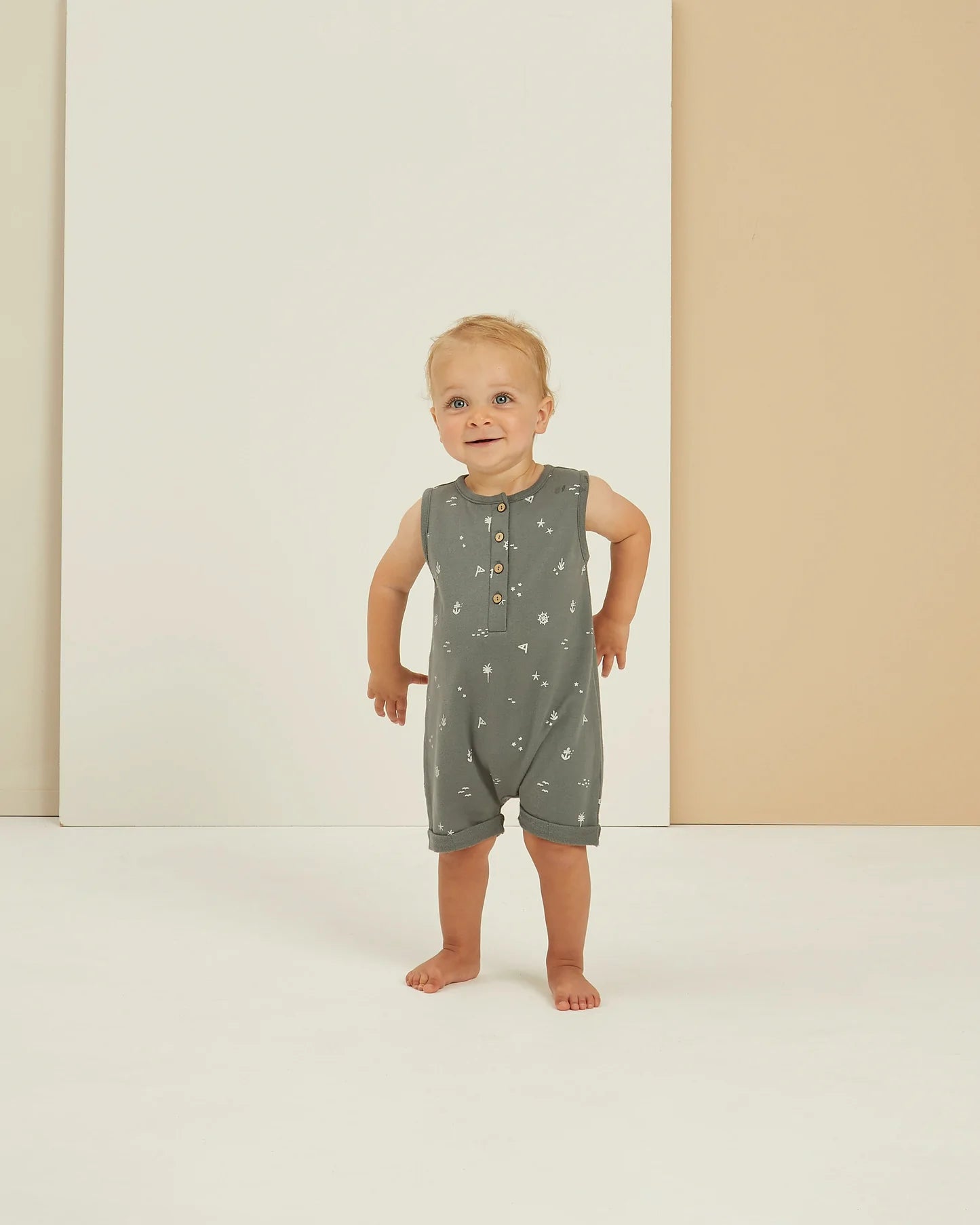 Lightweight french terry romper with wood button center front closure and cuffed leg openings.