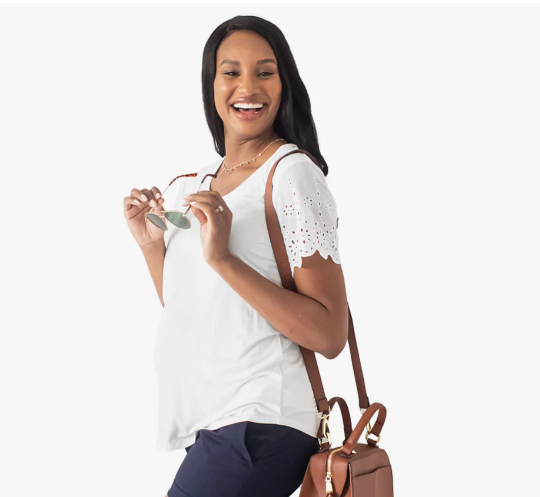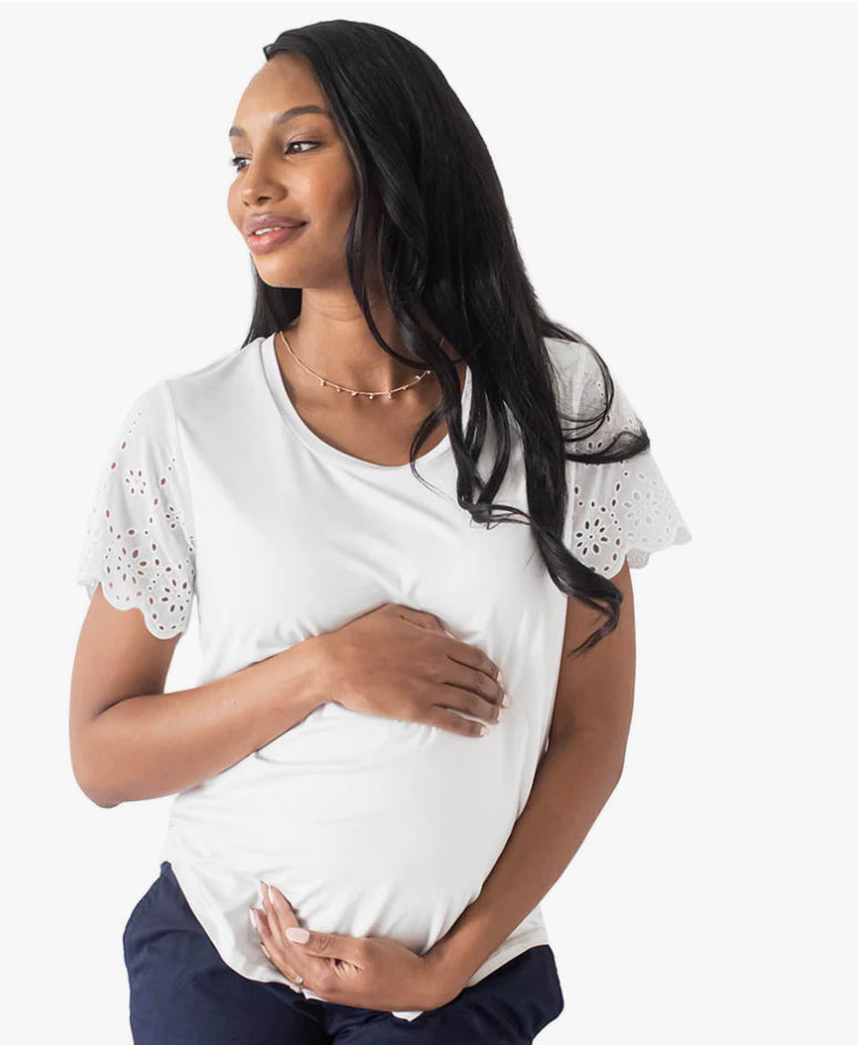 A super sweet maternity and nursing T-shirt you’ll wear long after your little one arrives! As soft as your favorite worn-in tee, this scoop neck maternity shirt will be your new go-to, day or night. The roomy-but-flattering cut means you can wear it throughout your entire pregnancy, and the hidden underlayer allows for easy, discreet breastfeeding -- plus, the two-layer construction creates a great drape and extra coverage. The woven, cotton eyelet fabric on the sleeves elevates this nursing shirt, making it even more adorable and versatile -- wear it to work or to play, with jeans or with joggers!