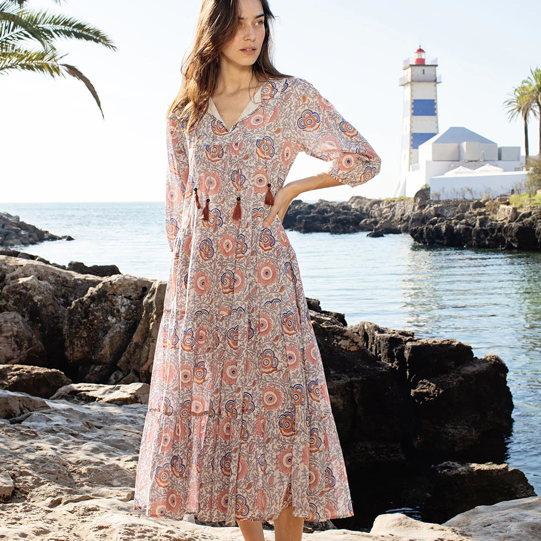 Pastel Perfection. Our dreamy Lisbon Floral, richly colored in dusty pinks and cool seaside blues, makes a sunny statement on our collection classic Womens Indira Dress. This fully lined, full length piece perfectly embodies our boho chic vibe. Works well with a sneaker for day and a leather boot for an evening out. Flattering for all women, including expectant mamas! Long sleeves and a double tassel tie at front are distinctive details. You'll find our beautiful Lisbon Floral woven throughout the collection making Mommy & Me and Big Sister / Little Sister moments easy to capture.