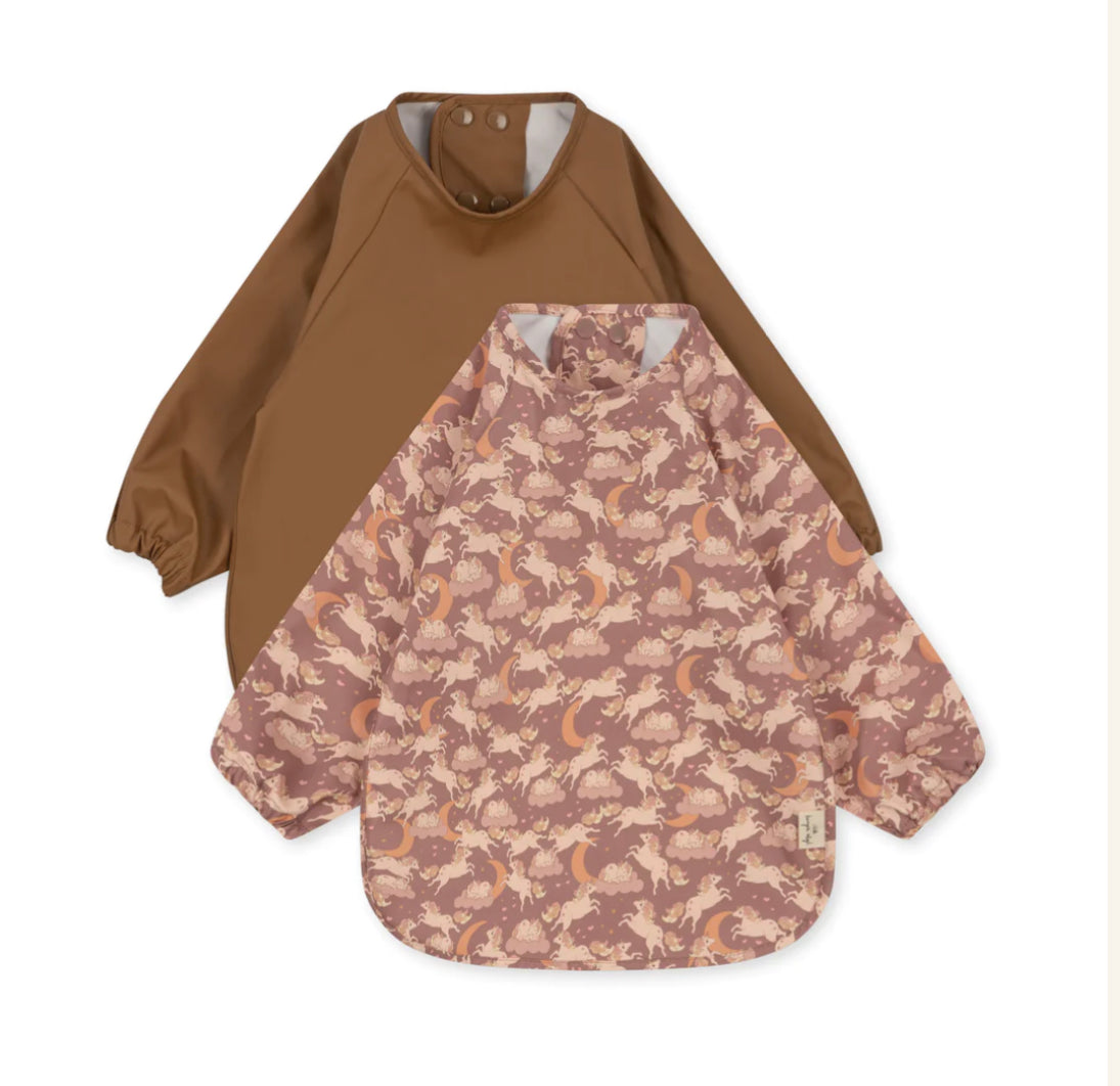 Introducing our 2 pack dinner bib with sleeves, perfect for messy eaters! These long-sleeved, washable dinner bibs come in fun patterns to make meal time more enjoyable. Protect your child's clothes and make clean-up easier with these convenient bibs. A must-have for any parent!The dinner bib with long sleeves come in a 2-pack with different prints and colors