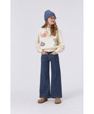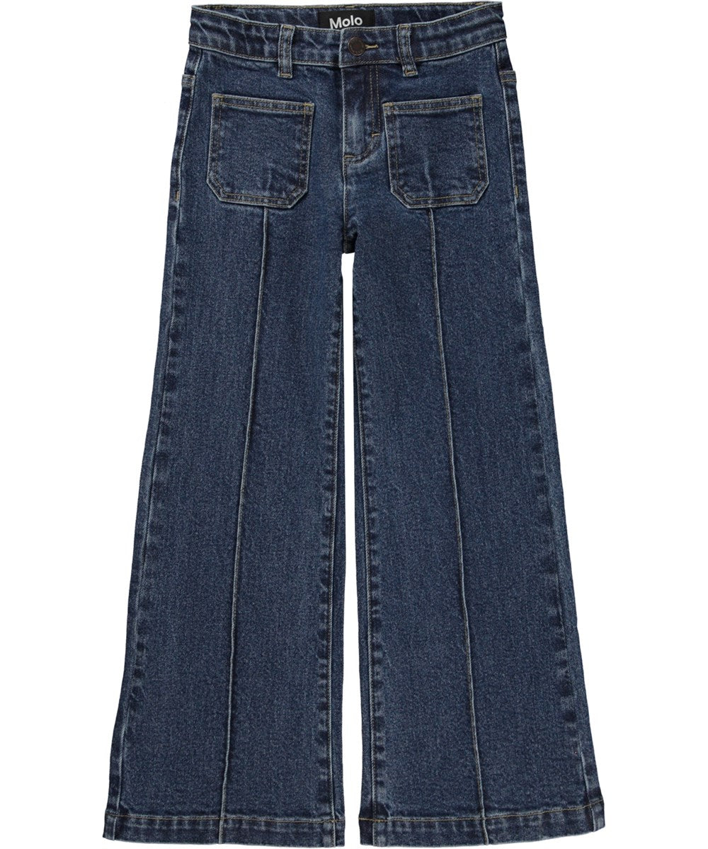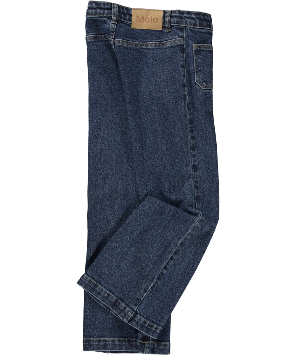 Dark blue, bootcut jeans with "press folds". These jeans are in cotton with 1% elastane to ensure comfortable, unrestricted movement. They have two patch pockets, "press folds", are in a bootcut style and in a regular fit. The waistband on the trousers can be adjusted with an inner elastic so they fit all children perfectly. Sizes 92-134 have a snap closure to make them easy to pull on and off. Sizes 140-176 have a regular jeans button.
