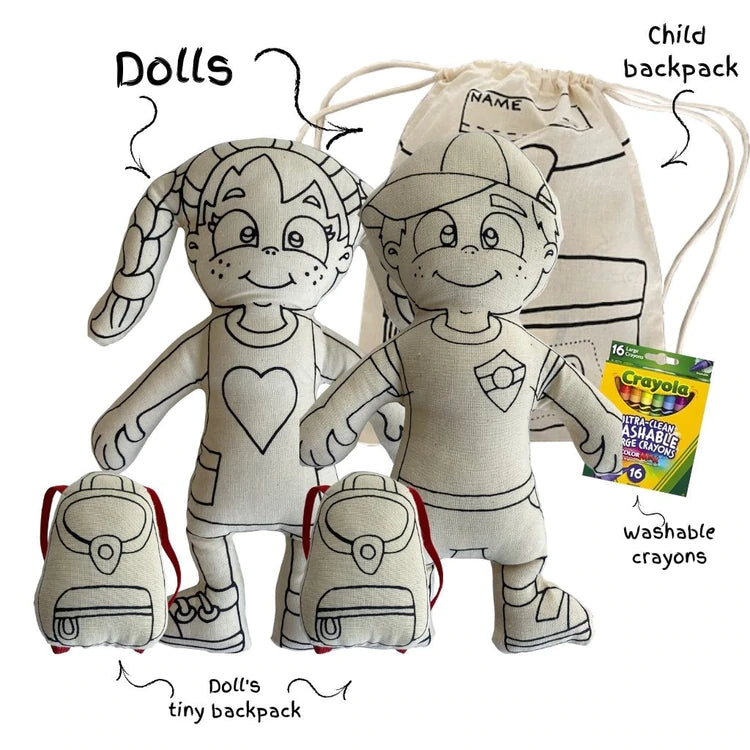 Kit includes doll, doll’s backpack, set of washable markers and drawstring backpack for coloring.