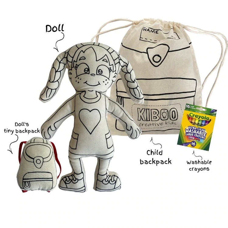 Kit includes doll, doll;s backpack, set of markers and drawstring backpack for coloring.