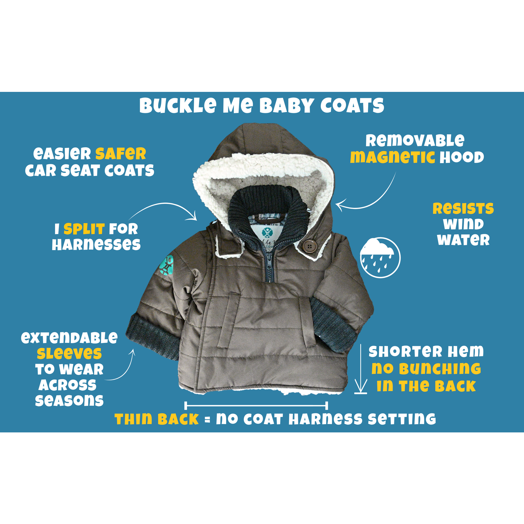As a one mama run small (potato) business, I take safety very seriously. I've crash tested so many coats and car seats to create the safest coat for your little one so you never have to worry about car seat safety or freezing weather again.