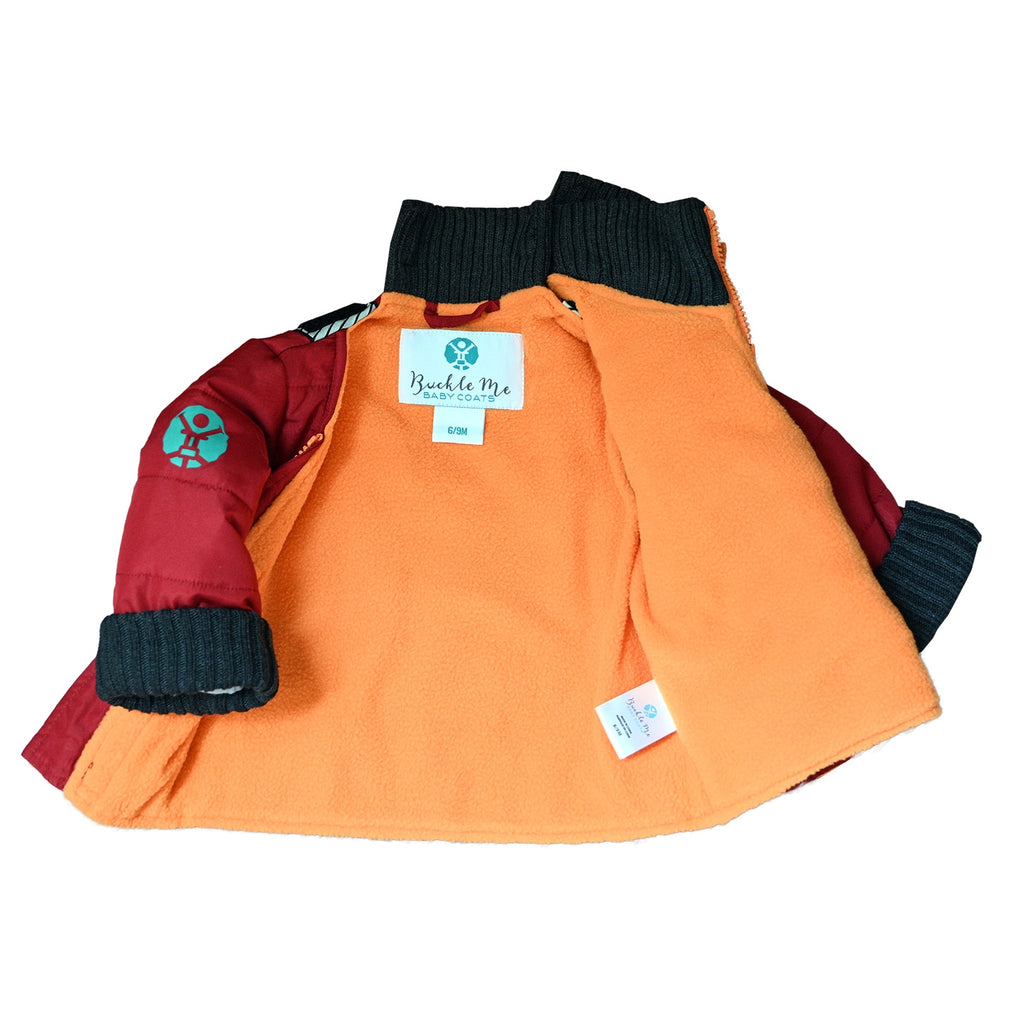 Coolest grey interior with bright orange flannel inside - this car seat coat keeps little ones warm all winter long. Fall in love with kangaroo pockets - perfect for hiding tiny treasures or giving cold hands a cozy place to snuggle.