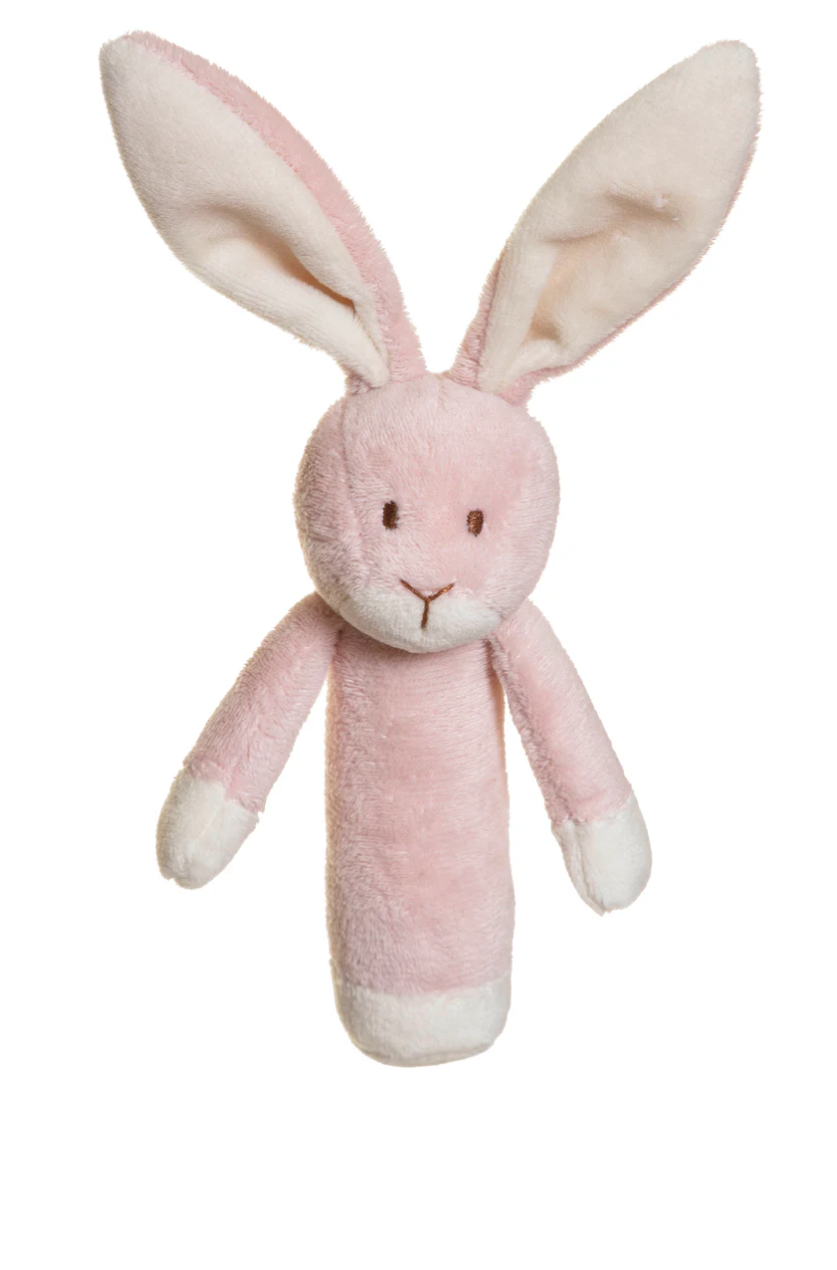 This rosy floppy-eared bunny rattle is the softest available in the US market. It will be a cherished crib companion day and night.