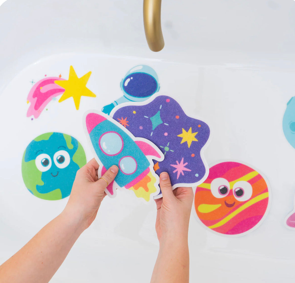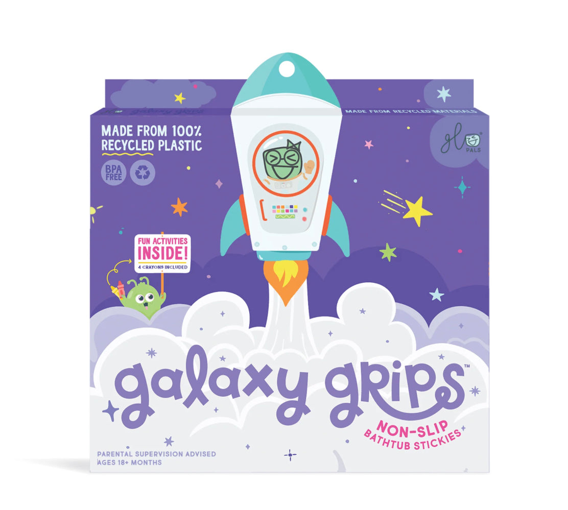3..2..1.. BLAST OFF at bath time with Galaxy Grips - non-slip bathtub stickies designed with your little one in mind. The textured, non-slip surface is fun and functional, meaning more bath time fun and fewer slips + slides.