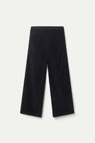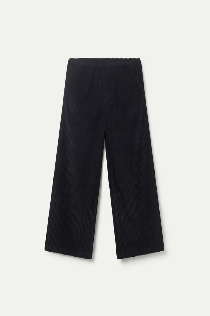 Girl's black corduroy pants. With elastic waist and straight leg. Side pockets. The model is 134 cm tall and wears size 8.