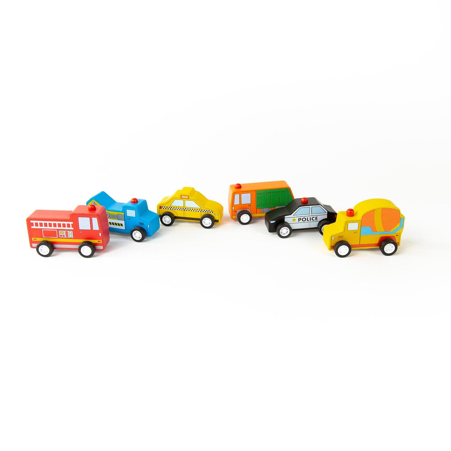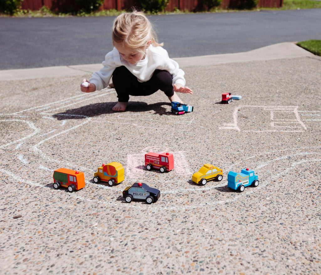 There’s everything you need to keep your town going with our little wooden pull back cars. Pull them back, then let go for a burst of speed. Includes fire engine, police car, taxi, tow truck, cement truck, and sanitation truck.