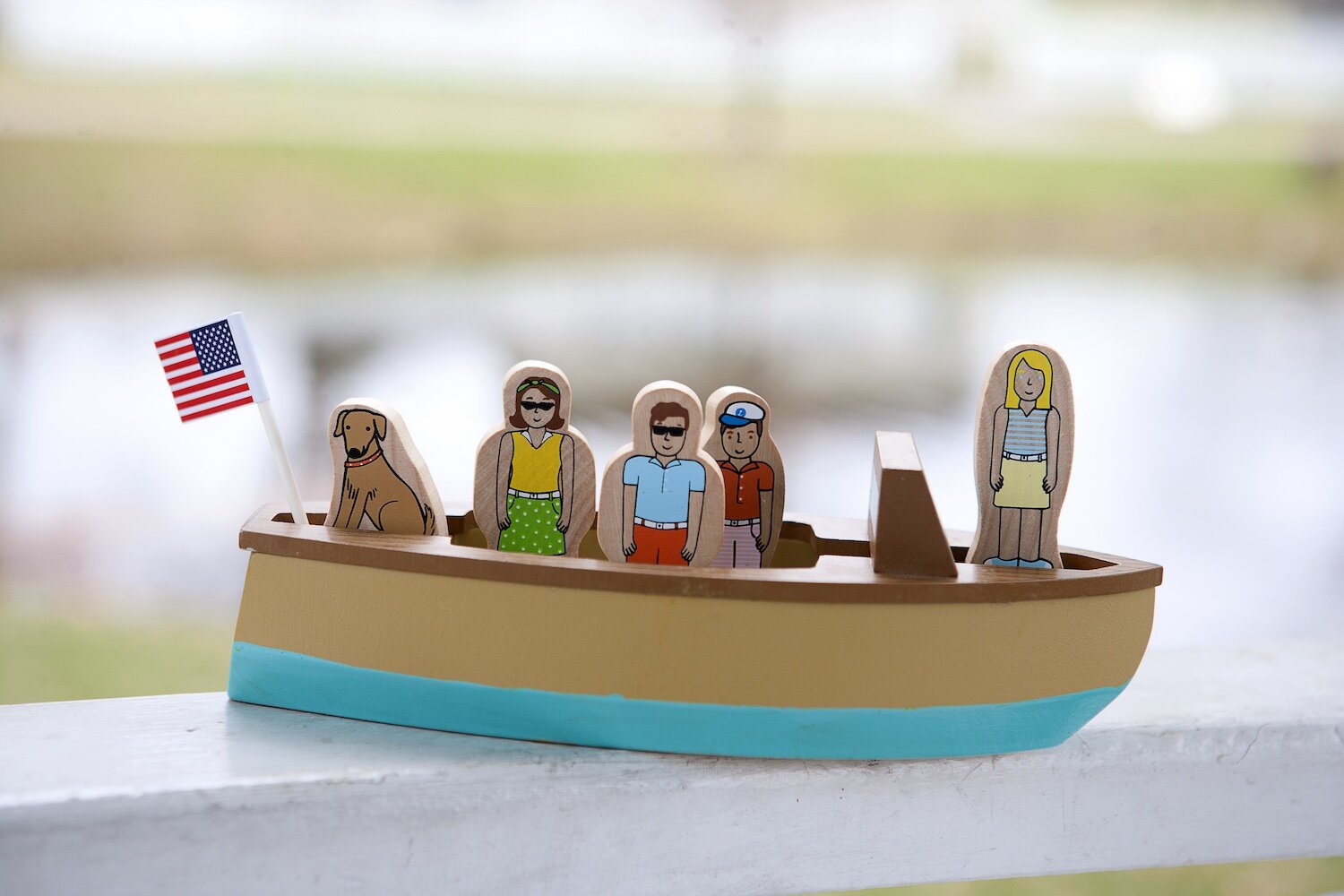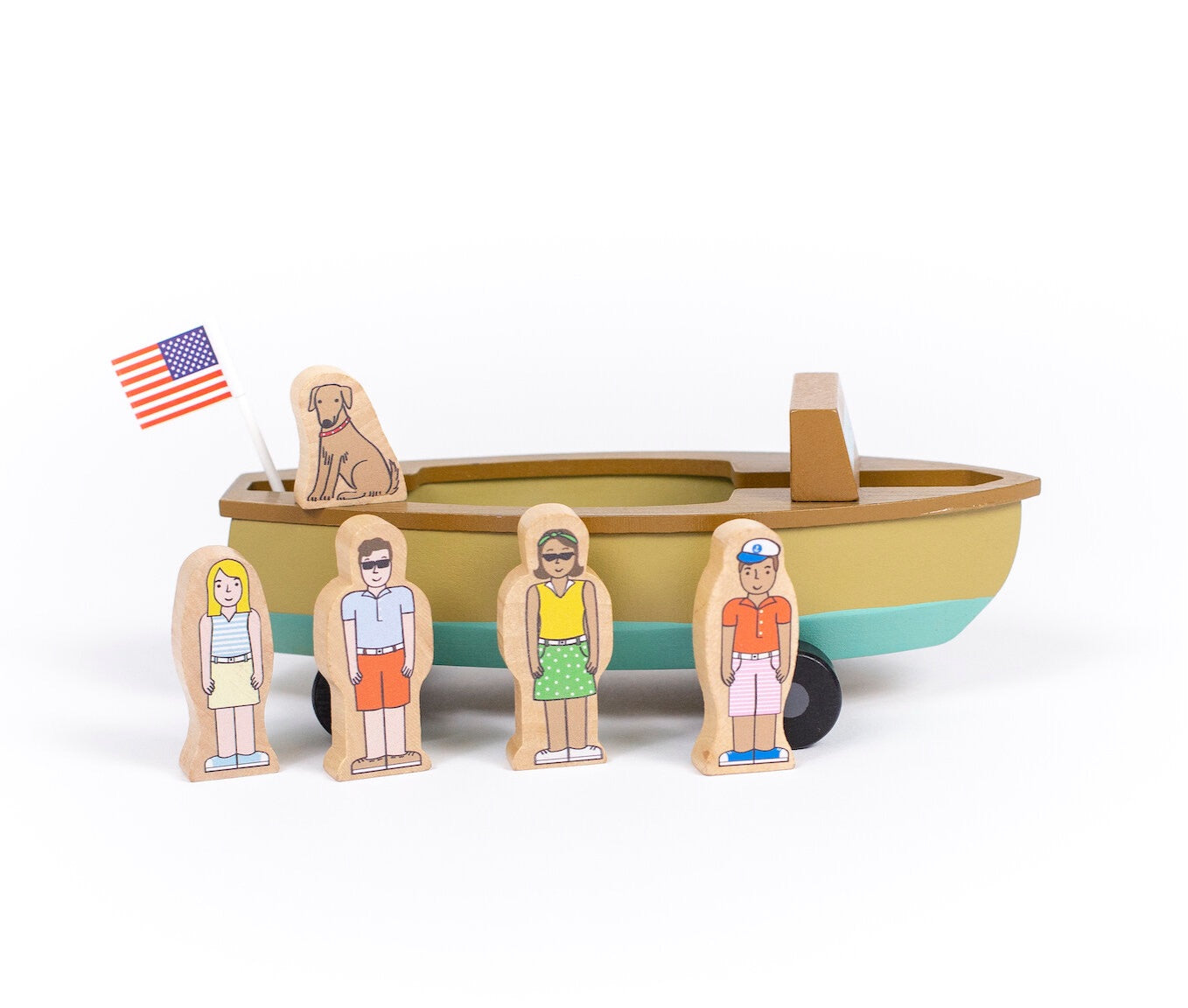 This cool vintage-style boat is ready to head out on an aquatic adventure with all of your best friends in tow - all with little magnets so they stay put on the go. Chunky figures make for easy play.