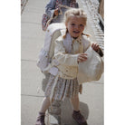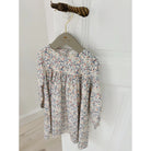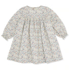 Dress made in 100 percent organic cotton seersucker. Designed with a flared cut, elasticated frill cuffs and a single mother of pearl button at the back neckline.