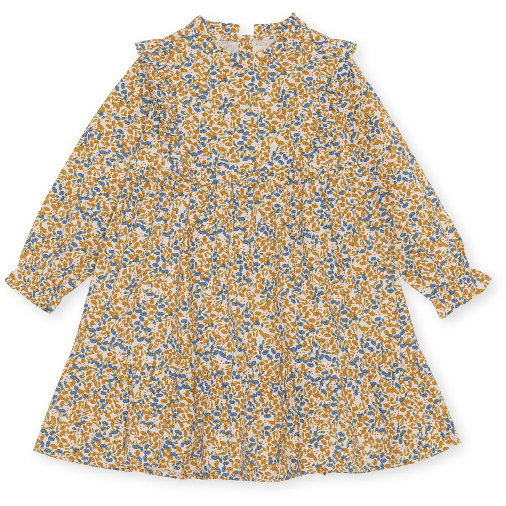 Soft cotton seersucker dress designed with a flared cut and long sleeves with elastic cuffs. The neckline is trimmed with a ruched smocked effect.
