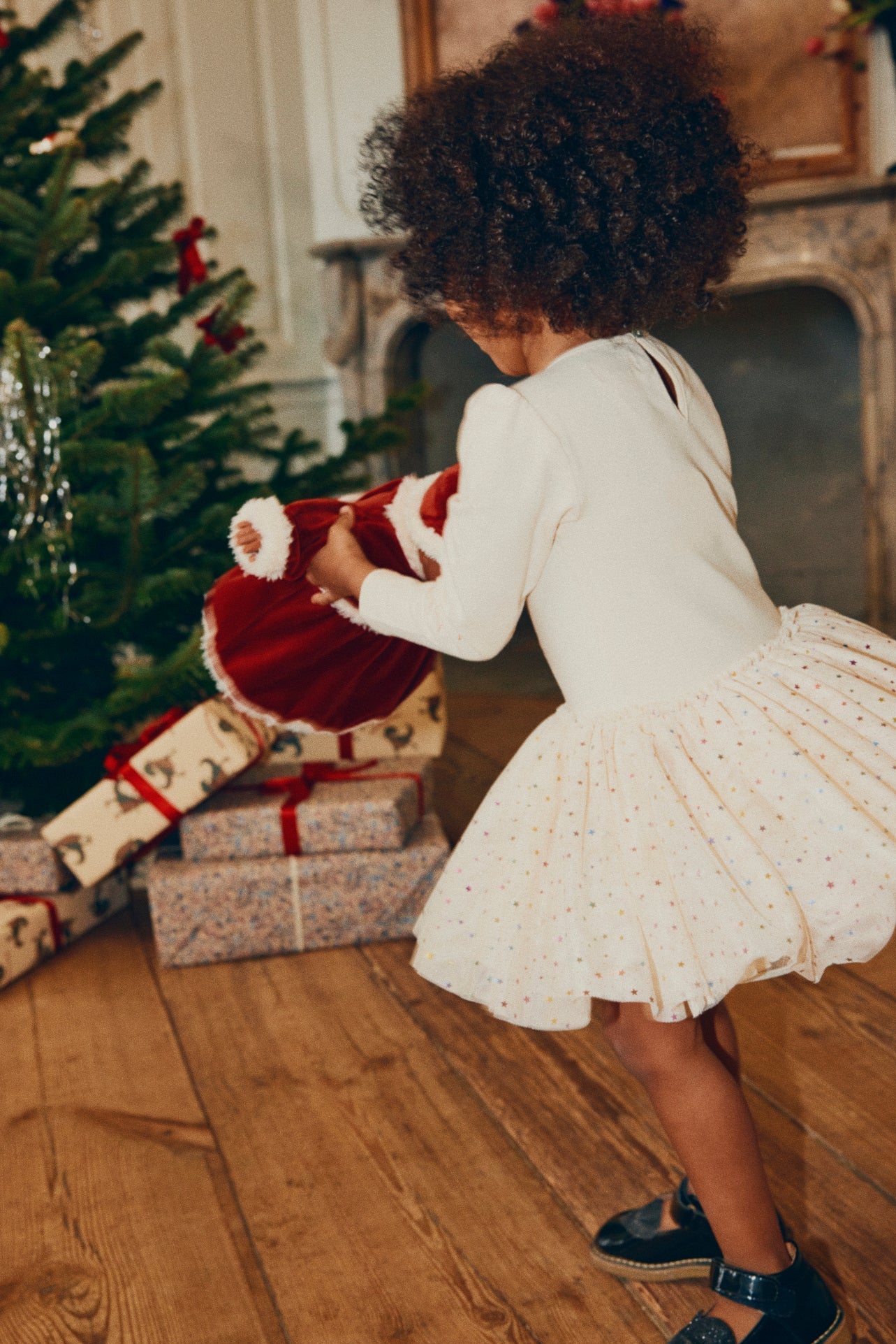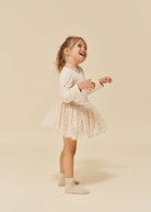 Long-sleeved ballerina dress with puff sleeves and layered tulle skirt. Closes with a single mother of pearl button in the back.