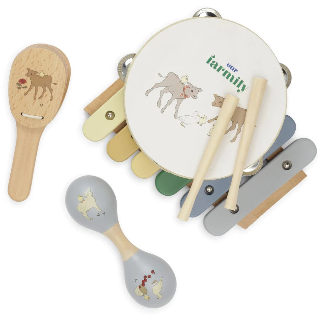Set of music instruments, including tambourine, castanet, maracas and xylophone with drumsticks. The instruments come in a little suitcase.