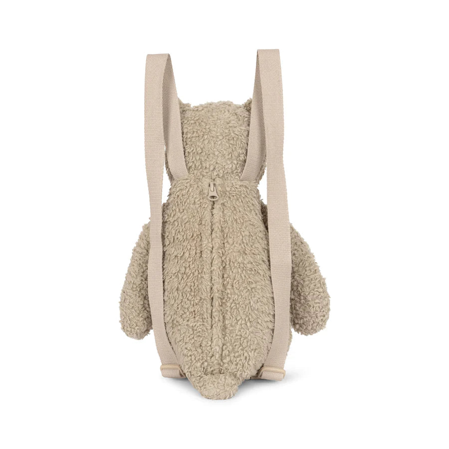 Teddy bear backpack made in 100 percent organic sherpa with recycled polyester filling. Designed with adjustable shoulder straps. The backpack features a practical hanger loop and a zippered compartment.