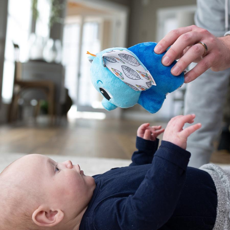 But it doesn't just squeak. The trunk also blows a puff of air for a gentle distraction that quickly turns tears into giggles!