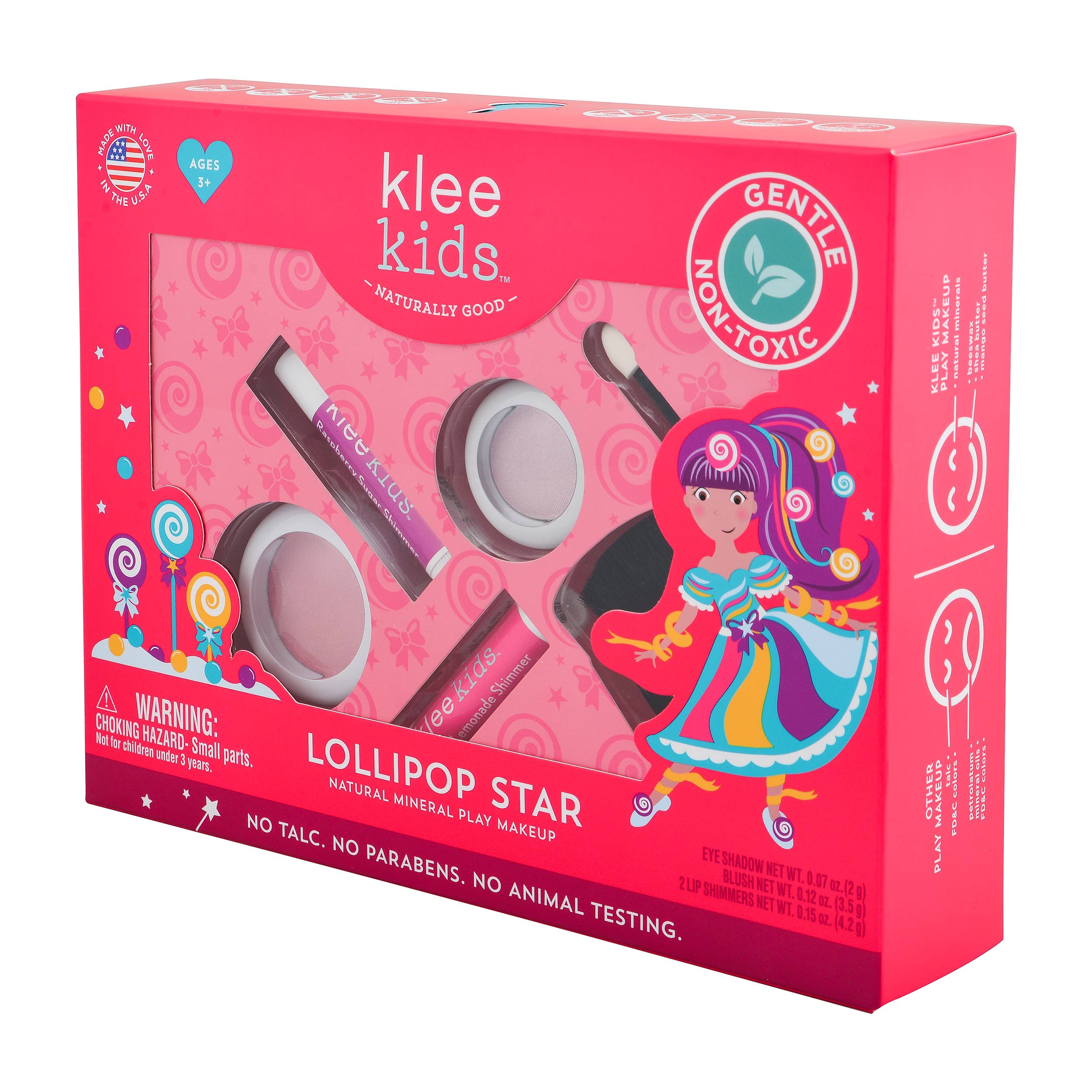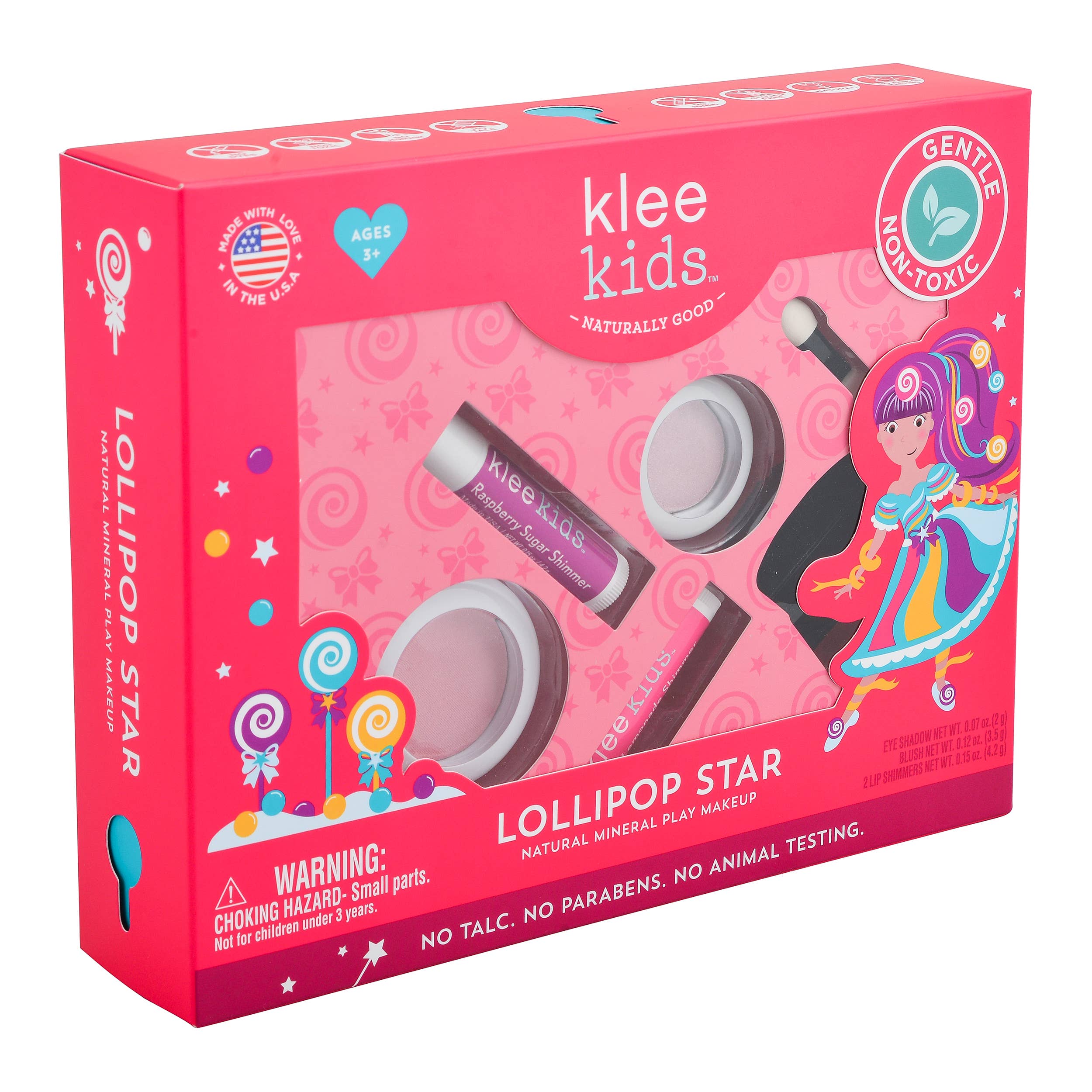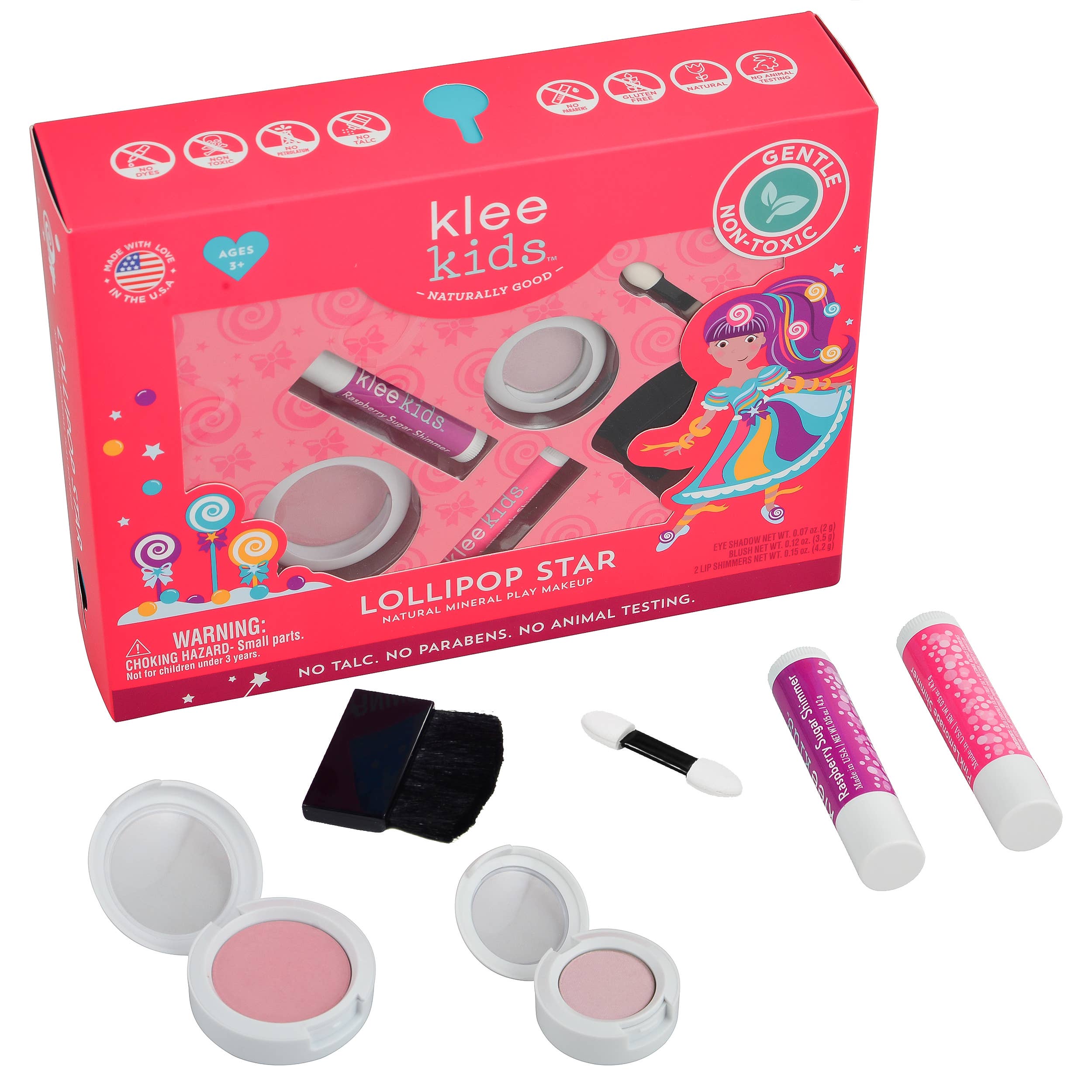 Pretend play can now be worry-free with Klee Kids Natural Mineral Makeup, formulated with NO talc, NO parabens, NO synthetic dyes and NO synthetic fragrances. No animal testing and gluten free. Lollipop Star includes the Pink Sugar pressed powder eyeshadow compact, Sweet Lolli blush compact, Pink Lemonade organic lip shimmer and Raspberry Sugar organic lip shimmer. Made in USA.