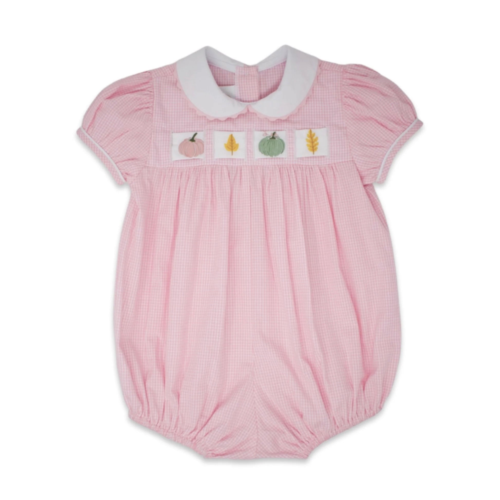 Light pink mini gingham pattern bubble with 3 interchangeable snap-on ribbons: 1) fall/harvest theme 2) Christmas theme, and 3) party theme.