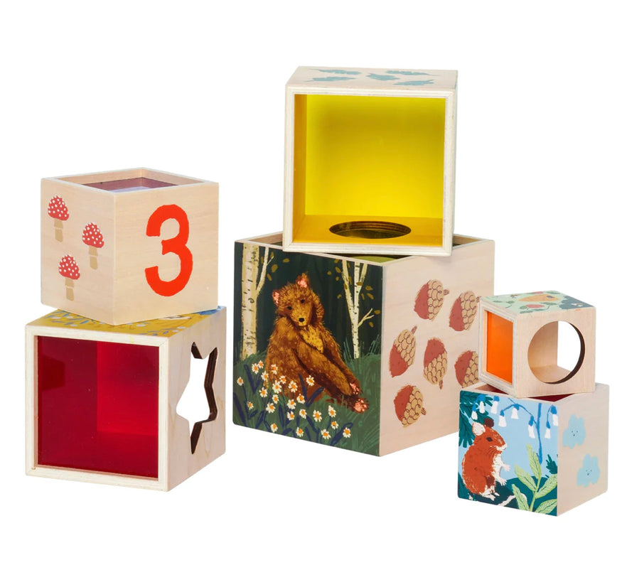 Alluring indeed! More advanced than basic stacking blocks, our one-of-a-kind Enchanted Forest wooden sorting stacking toddler toy is a 12-piece set that includes 6 wood blocks, each with a different transparent colored acrylic panel and 6 coordinating wood shapes (star, circle, triangle, square, heart, and oval). An ideal first birthday gift, this early learning toy for 1-year olds and up offers many ways to play - stack, sort, and practice colors, numbers, shapes, and animal recognition! Each block has a unique feature or illustration on every side - a drawn number, an animal or plant pattern representing a numbered quantity, a woodland scene, and a shape-matching cut-out.