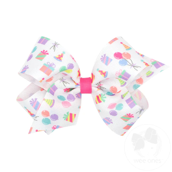 You'll want to celebrate every day when you wear this medium printed grosgrain bow that's accented with balloons, party hats, and presents! These bows are sure to stay in her hair all day with our patented WeeStay™ no-slip hair clip.