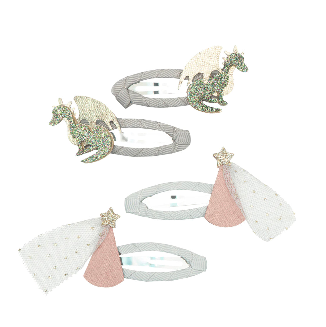 A magical match made in hair heaven! These dainty little dragon and princess hat hair clips are as perfect for parties as they are for everyday fairytale play!