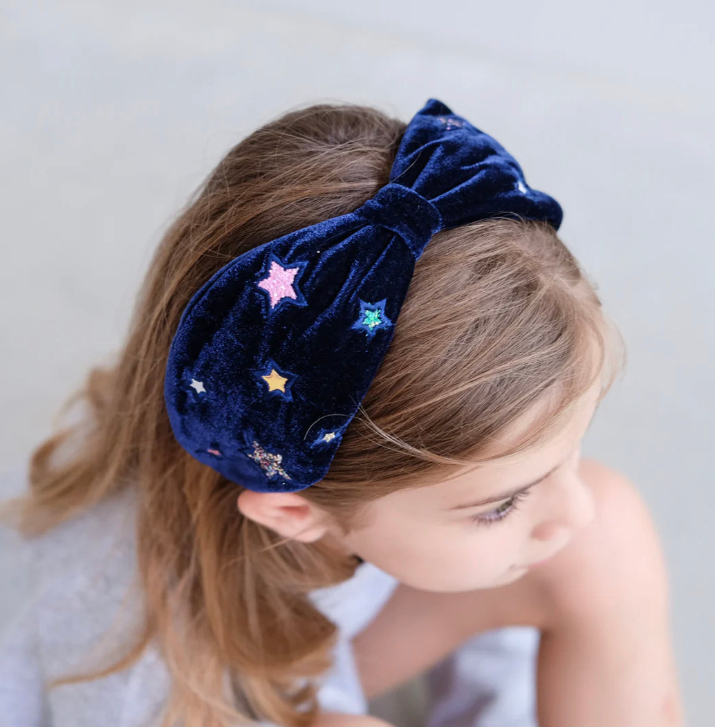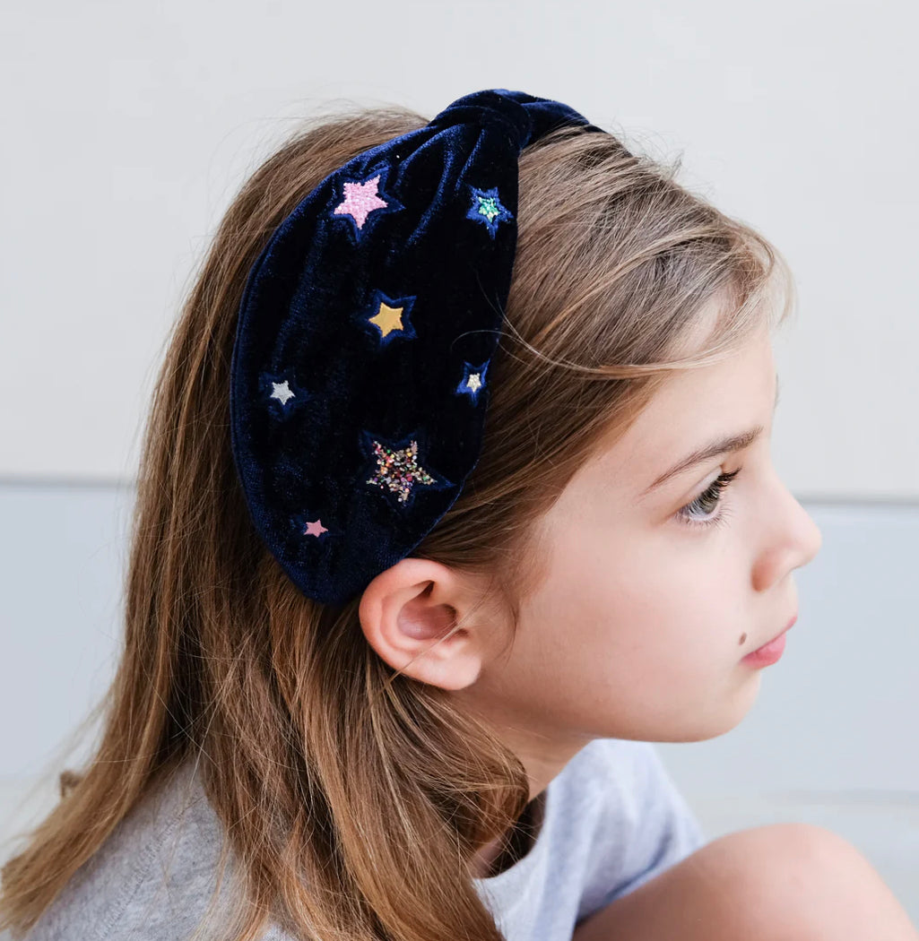 Let them step out in style with this luxurious velvet alice band! Featuring an array of embroidered glitter and metallic stars, this alice band will add the finishing touch to any outfit!