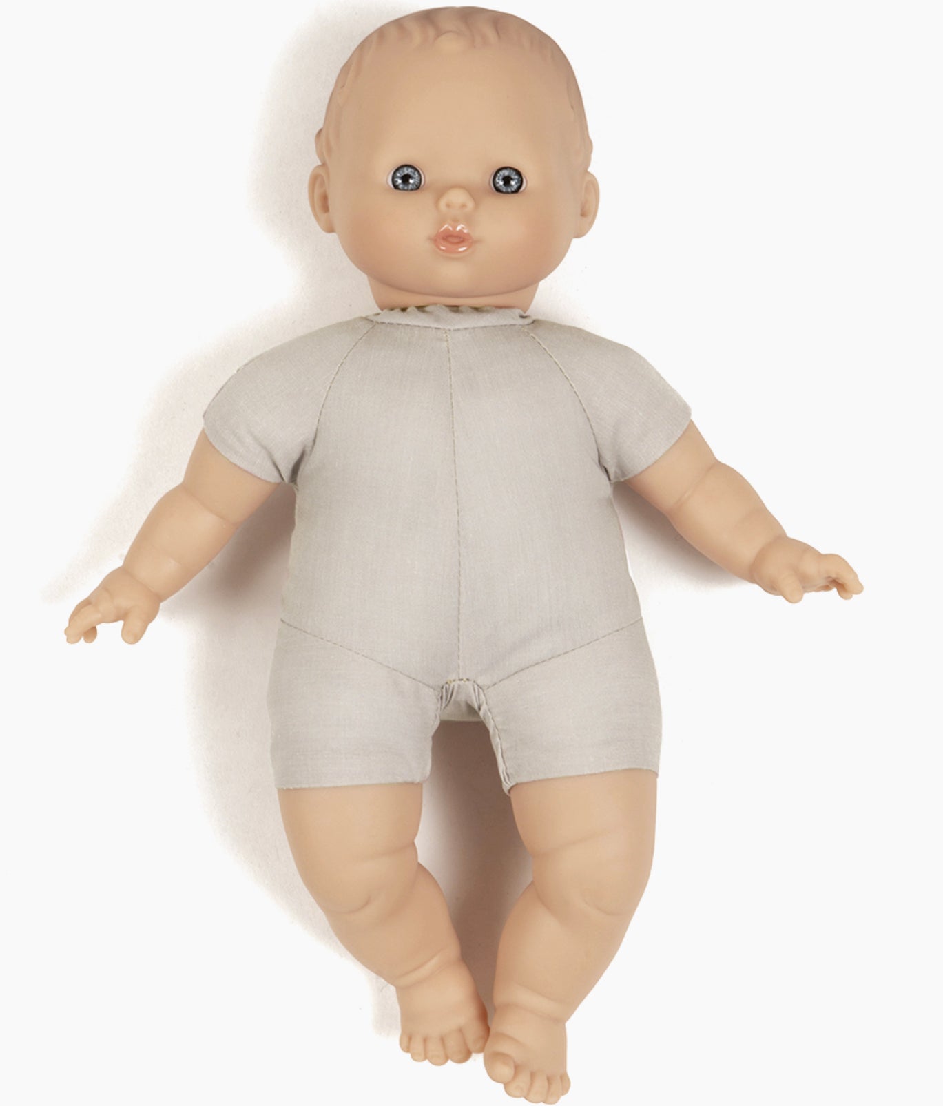 Claire, 28cm Minikane Vintage Babies doll with soft body and gray blue eyes.