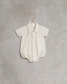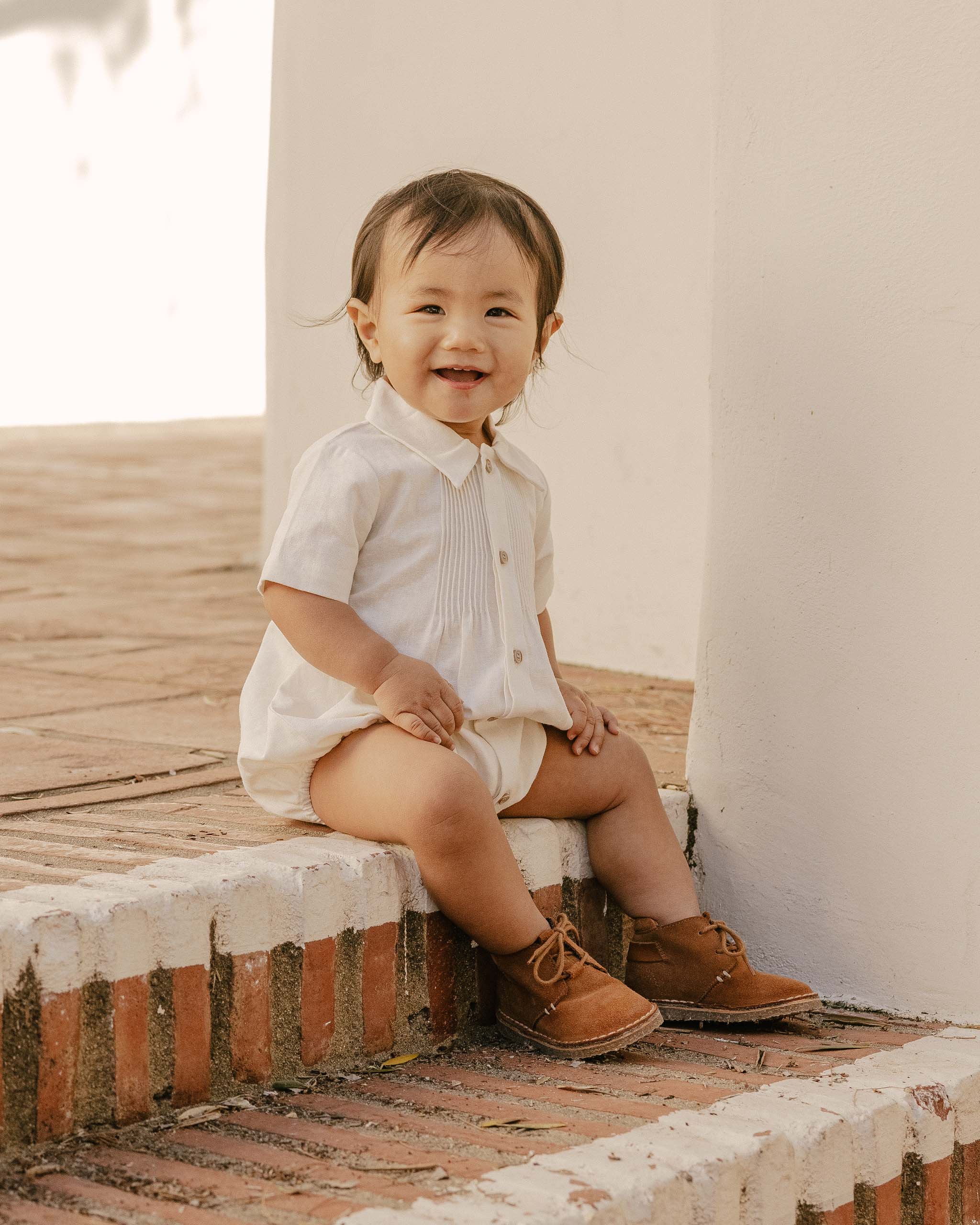 A linen bubble romper that’s comfortable and lightweight with a classic fit for the most elegant occasion. Featuring a fold-over collar, pipped details on the chest and a fabric belted waist. It's fully buttoned from top to bottom for easy changing.