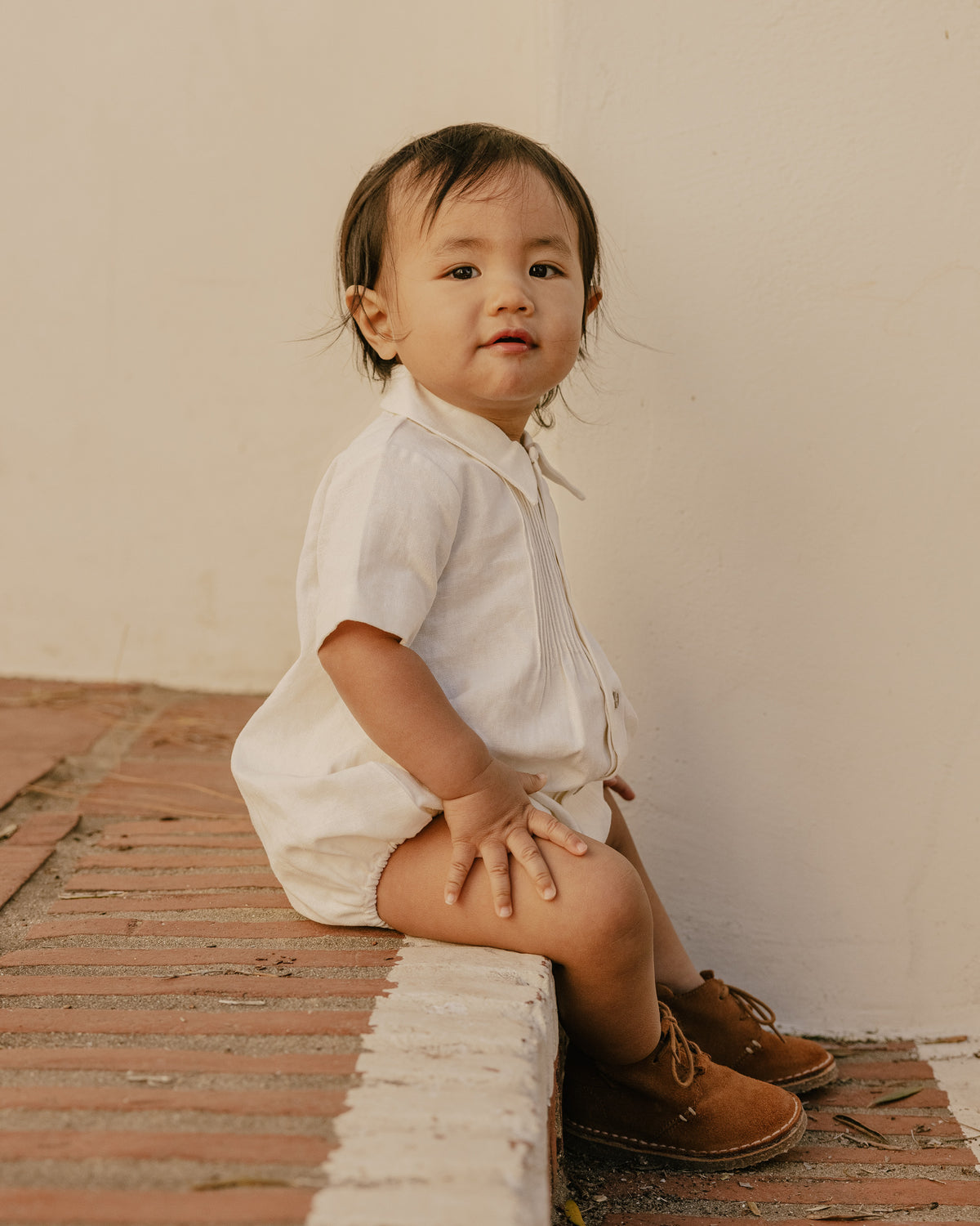 A linen bubble romper that’s comfortable and lightweight with a classic fit for the most elegant occasion. Featuring a fold-over collar, pipped details on the chest and a fabric belted waist. It's fully buttoned from top to bottom for easy changing.