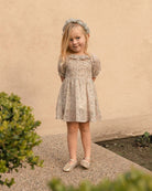 This vintage-inspired dress features a sweet metallic dash chiffon, smocked bodice, and puff sleeves.