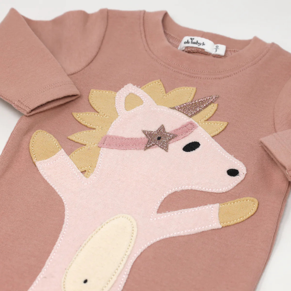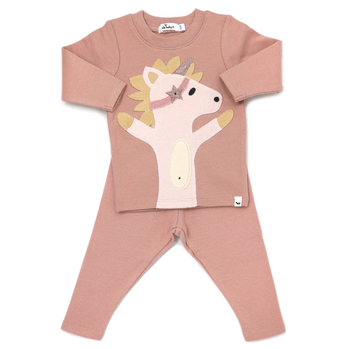 Unicorn applique on a soft cotton long sleeve blush tee. Matching elastic waist pants in blush. Available in infant sizes. Designed in Minnesota.