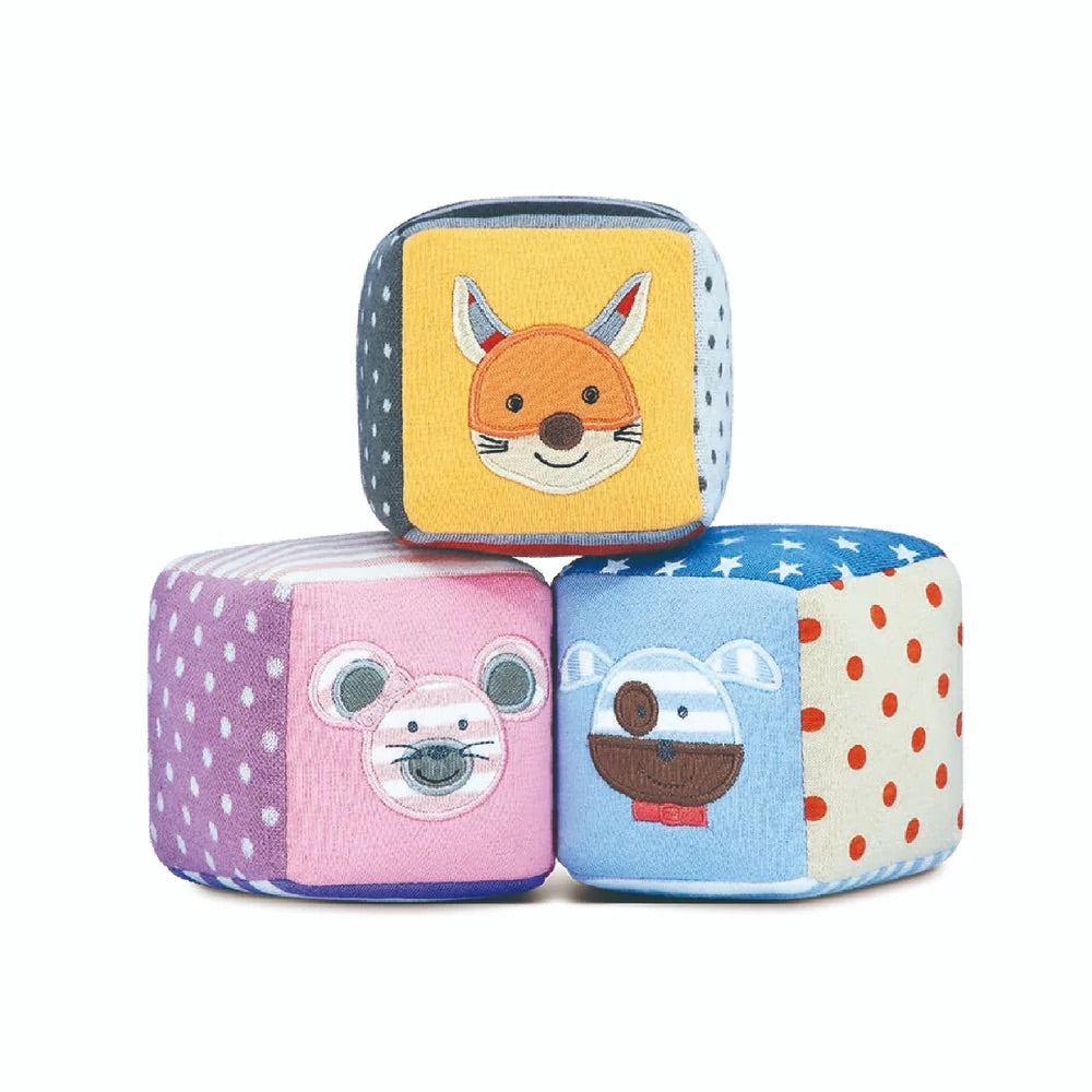 These are the funnest organic cotton soft blocks! They feature a dog, a mouse and even a fox!