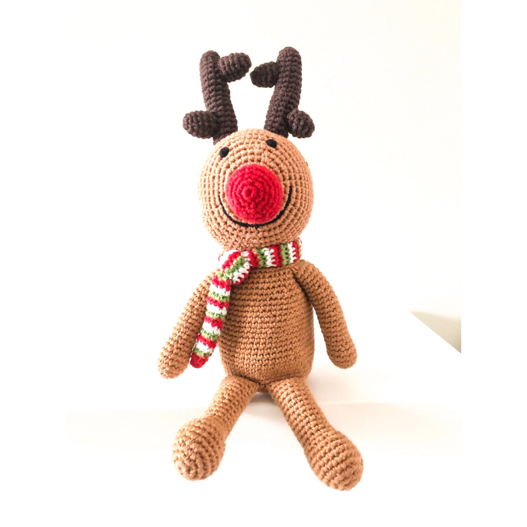 A larger version of our beloved Rudolph Rattle. His nose is red and he's all aglow, ready to lead the sleigh of Christmas delights. With a colorful scarf to keep him warm, he's ready for anything. Handmade with cotton yarn, this knit toy is sure to be a flying favorite. The rattle inside gives a soft sound when shaken.