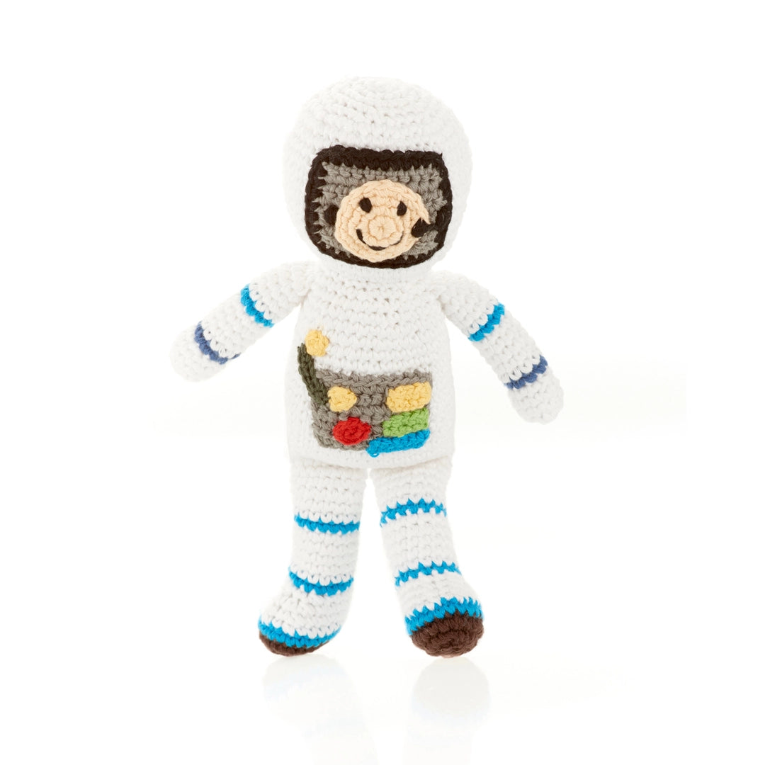 This happy little spaceman toy can't help but smile from inside his white astronaut suit. He is ready to fly to the moon and back with your little one. Handmade with soft cotton yarn, this knit toy is perfect for hours of imaginative play. The rattle inside gives a very soft sound when shaken.