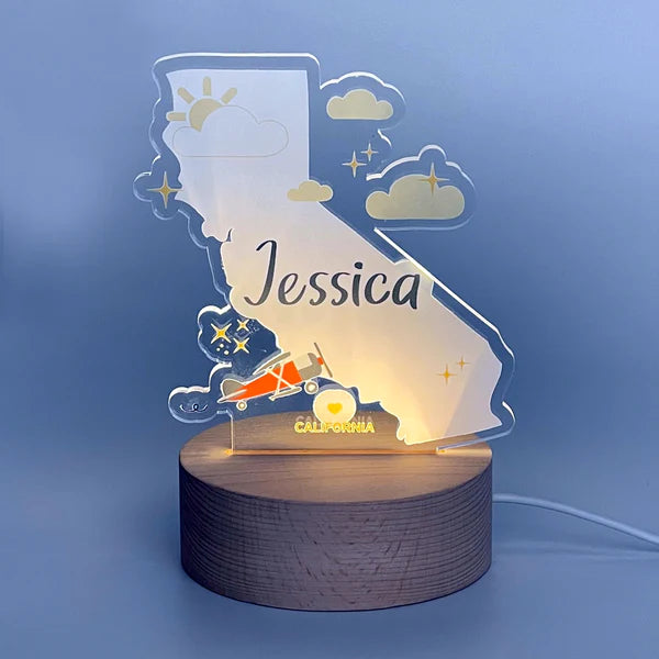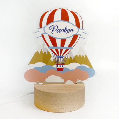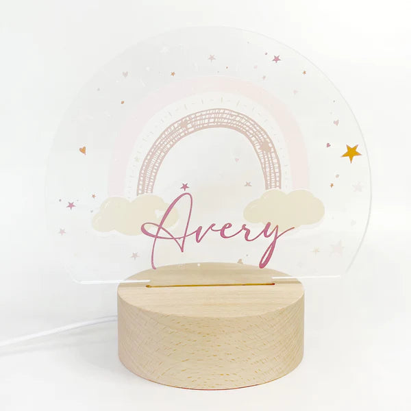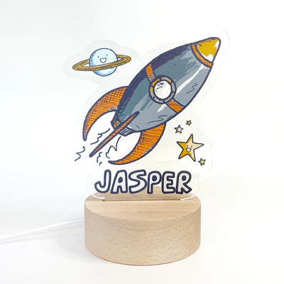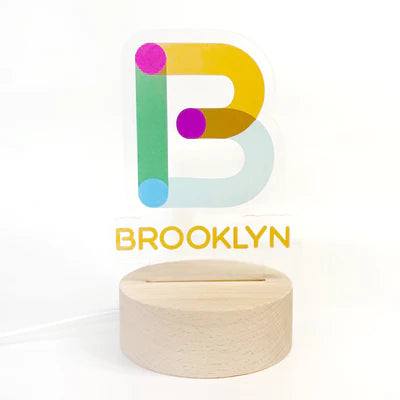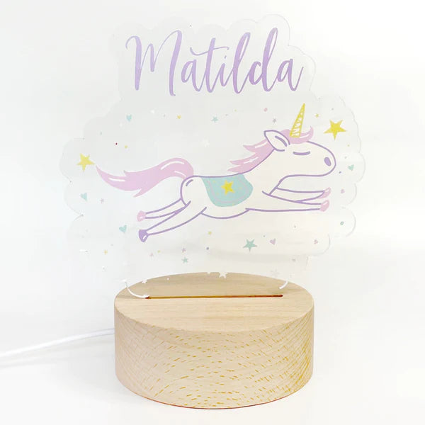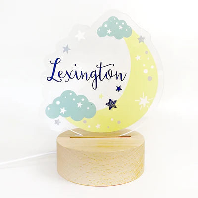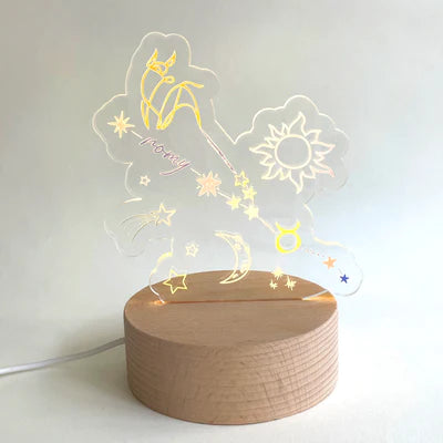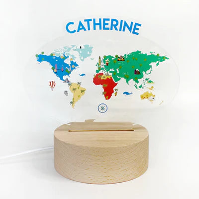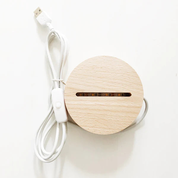Personalized with name | Engraved or UV printing on clear acrylic plaque inserted into round wooden base | Maximum measurement of 18cm | LED light strip and USB on/off switch used.