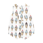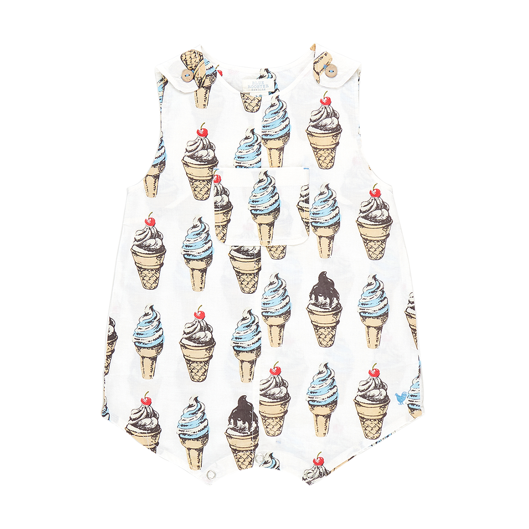 Ice Cream Social! You will want a double dip of our adorable new Soft Serve conversation print shown here on our Baby Boys Noah Jumper. We love the center pocket detail, faux wood button closure at shoulder, and blue stitching on the pocket and buttons. Ring snaps at bottom allow for easy diaper changes. Made of 100% cotton cambric. We are dishing up Soft Serve on several pieces in our Summer clothing and swim collections making matching sibling moments easy to accomplish.
