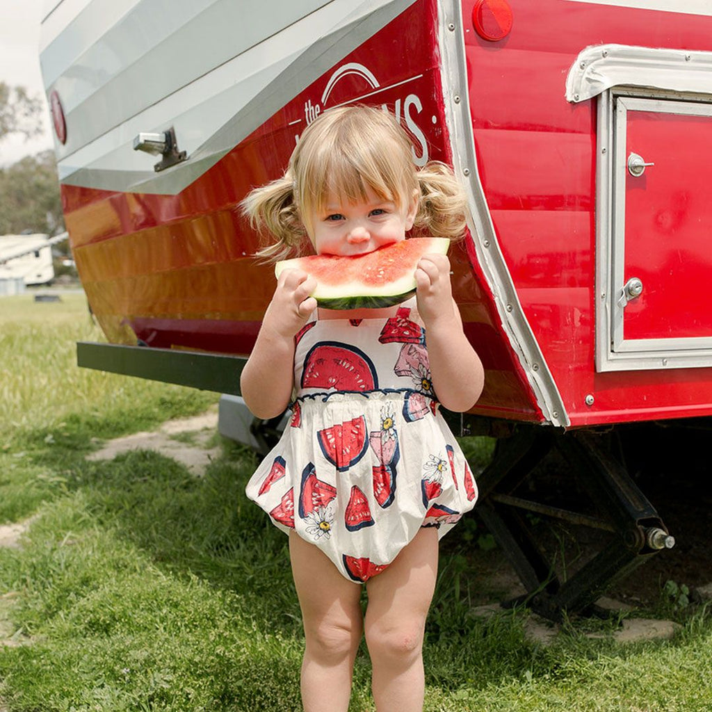 Summer’s Sweetest Treat! Scattered wedges of juicy watermelon sweeten a crisp white ground on our Baby Sierra Bubble. A contrasting navy ruffle across the chest and smocked back define the delightful shape. Ruffled shoulder straps and forgiving navy tipped elastic leg openings make it easy for baby to move. Ring snaps at bottom allow for easy diapering.